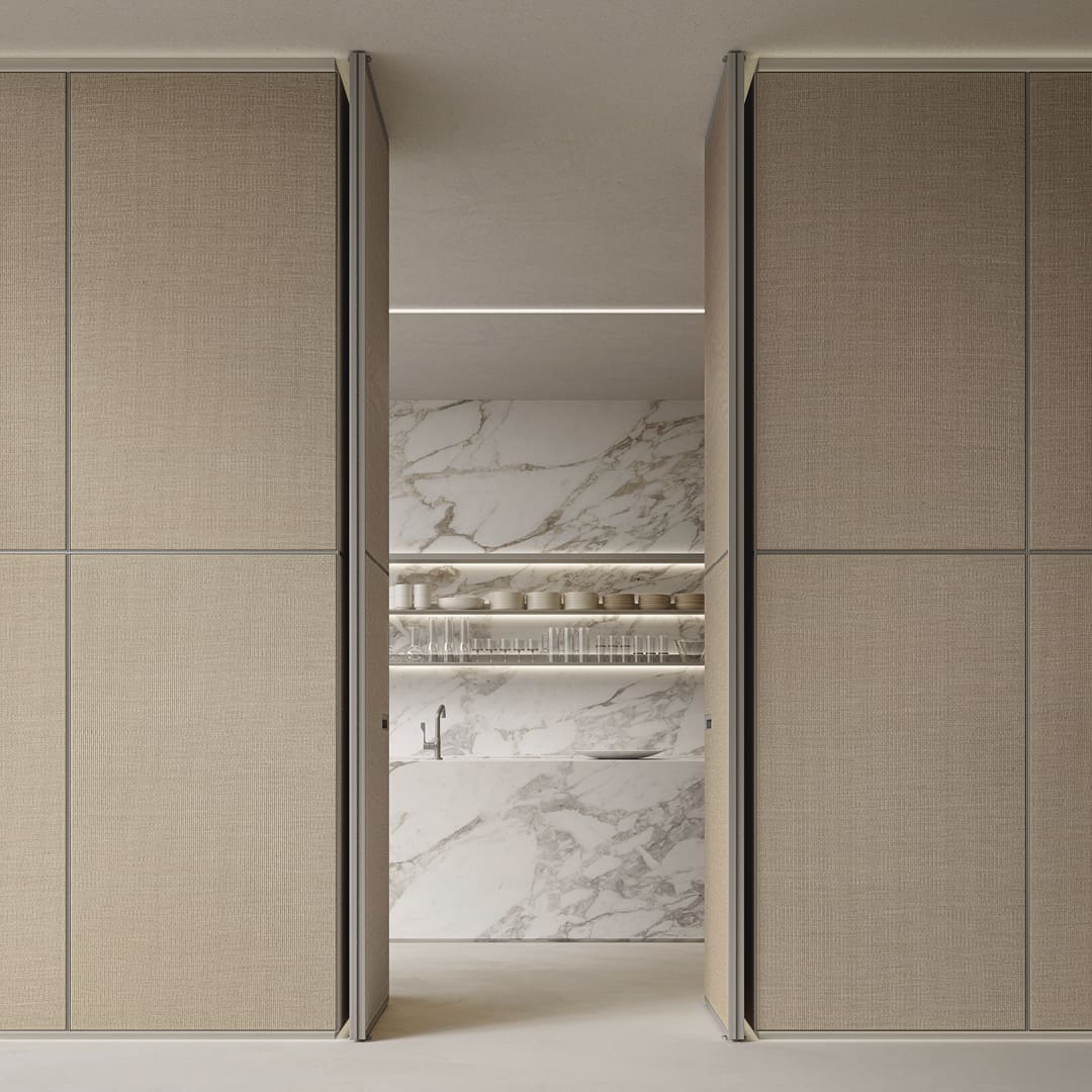 Door integration depends on grid alignment and hardware coordination. Concealed hinges, flush handles and magnetic latching hold the door within the panelling datum so reveals stay consistent and thresholds remain visually clear. The outcome is a wall surface that reads as one composition, with access and movement resolved into the same architectural language.
