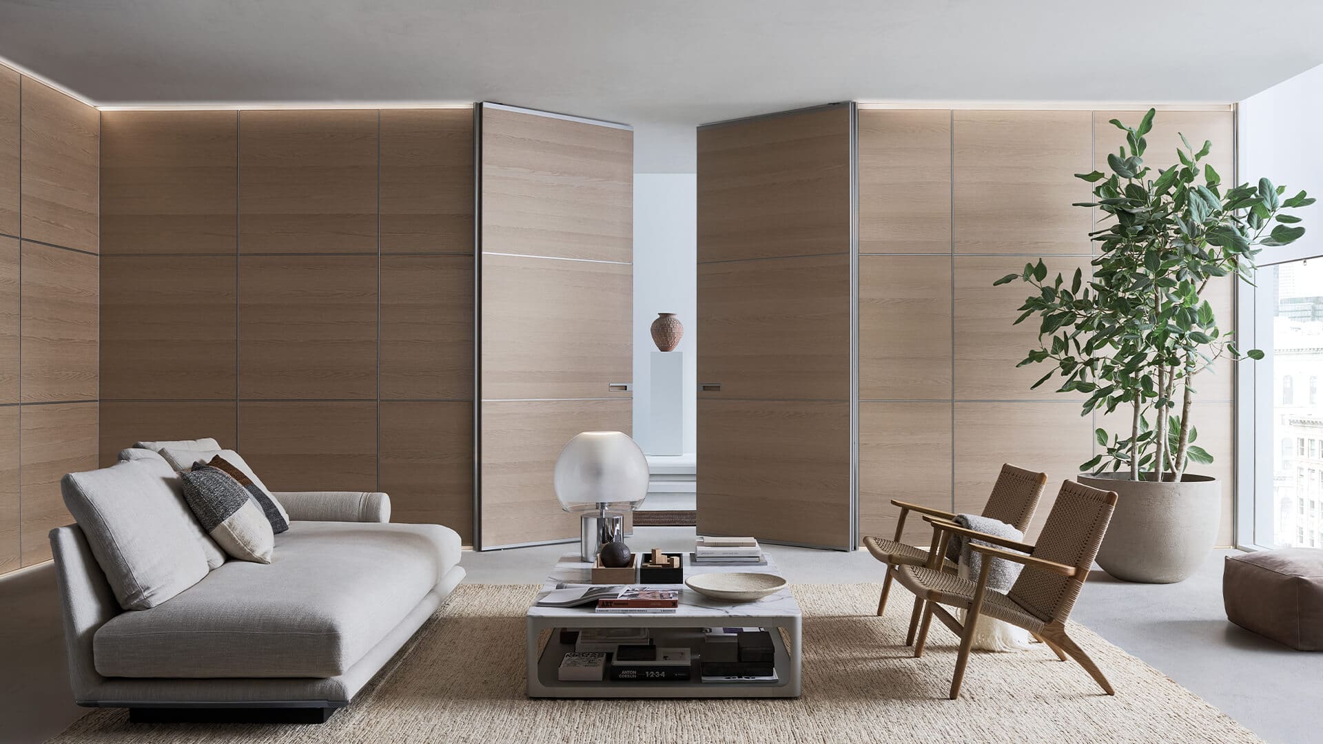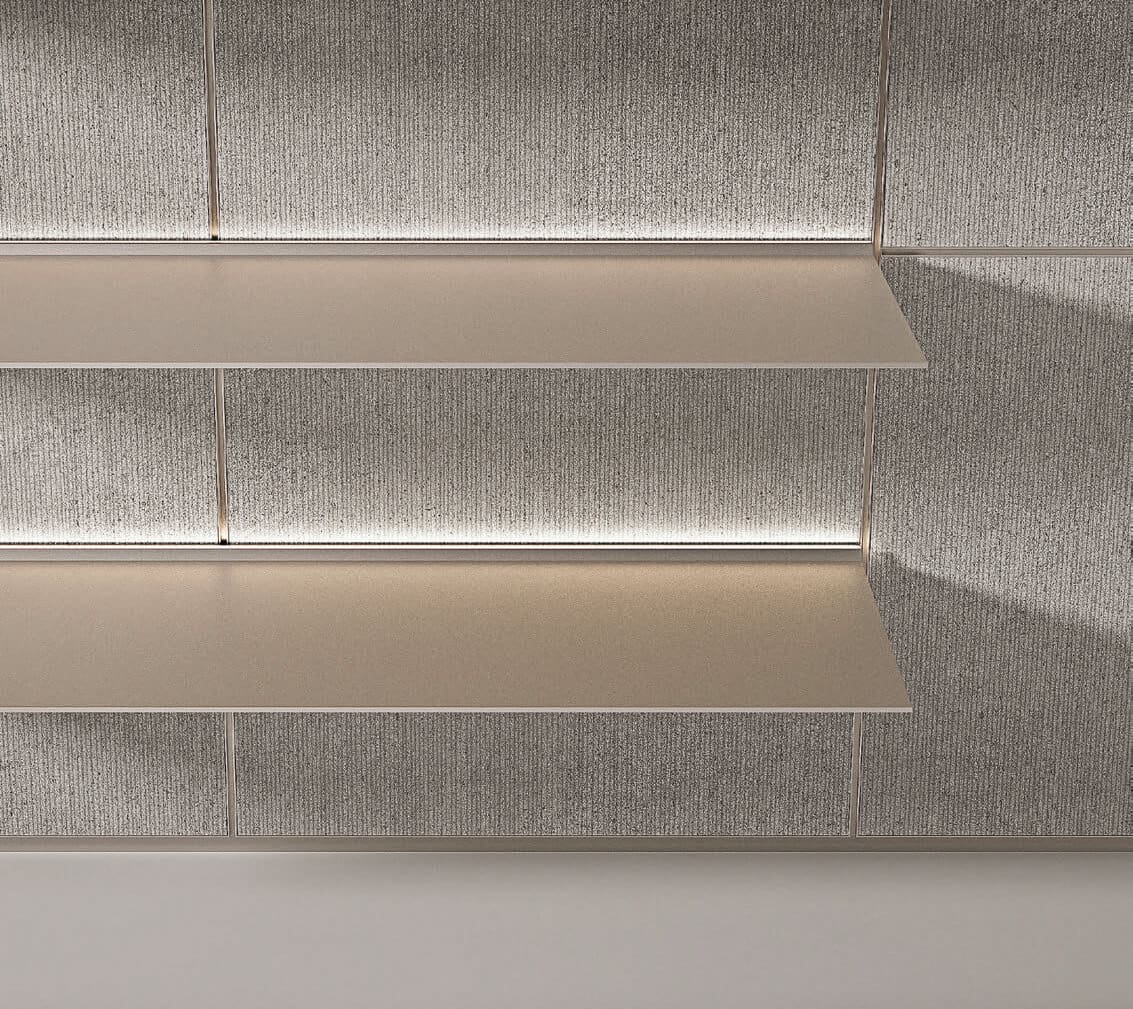 Rimadesio’s Modulor system demonstrates this approach through modular geometry and consistent datum lines. Hinged doors, glass display cabinets and floating shelving integrate within the same grid, with reveals and junctions aligned so the wall reads as one uninterrupted composition while still performing as storage, access and display.