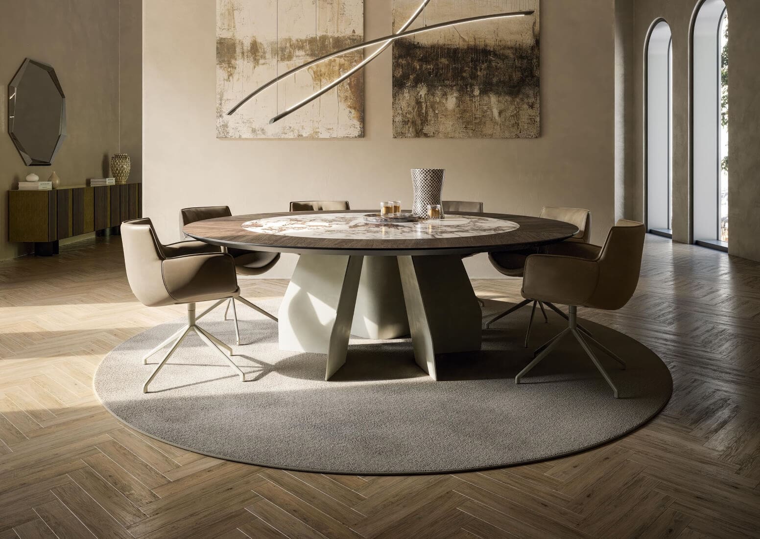 Dream Design specifies Cattelan Italia where the brief calls for pieces with clear geometry and strong material presence, placed with discipline so the room reads coherent. In dining spaces, table scale and chair comfort shape how the room works day to day; in open-plan living areas, placement and sightlines influence how zones hold together.