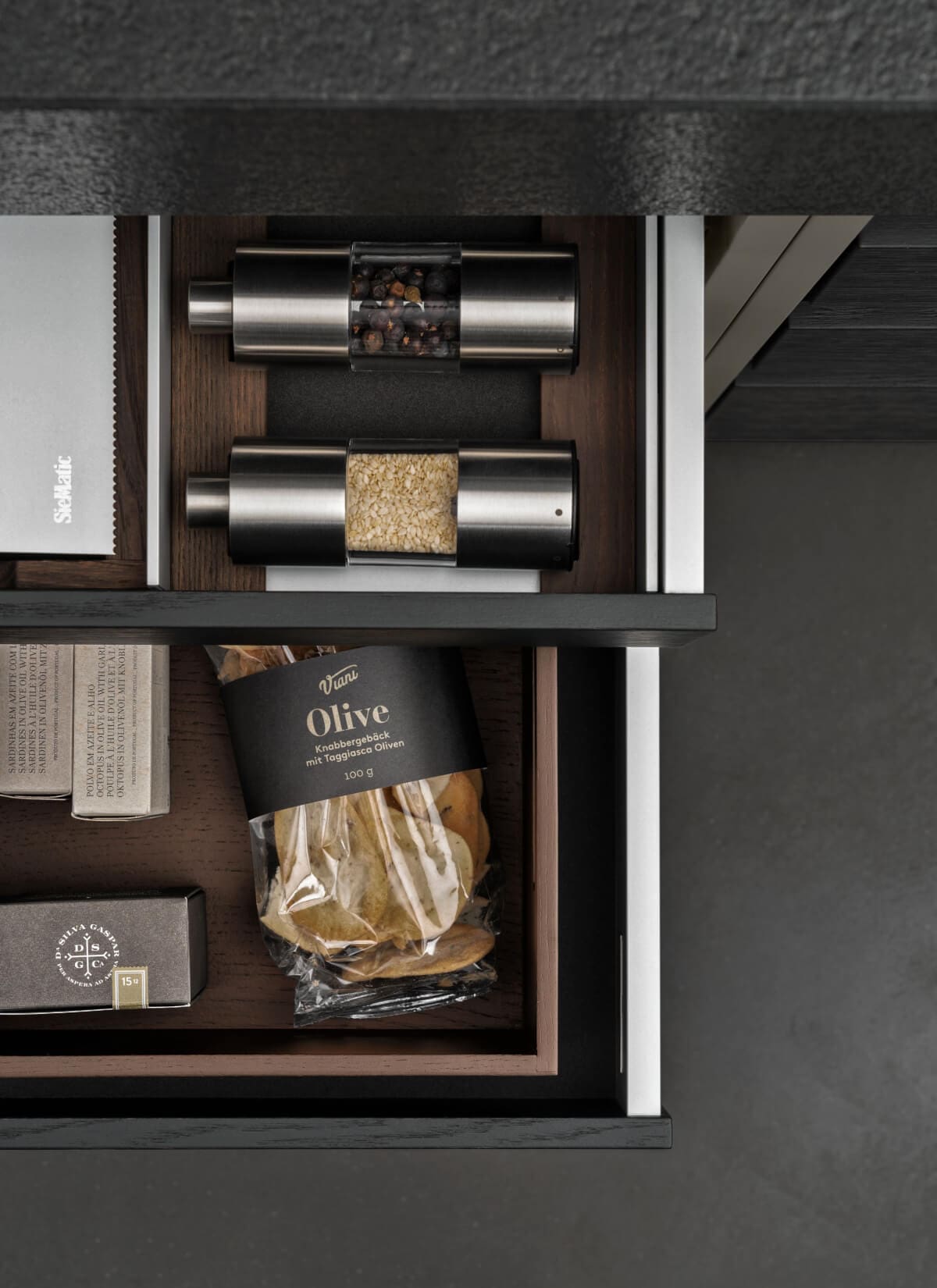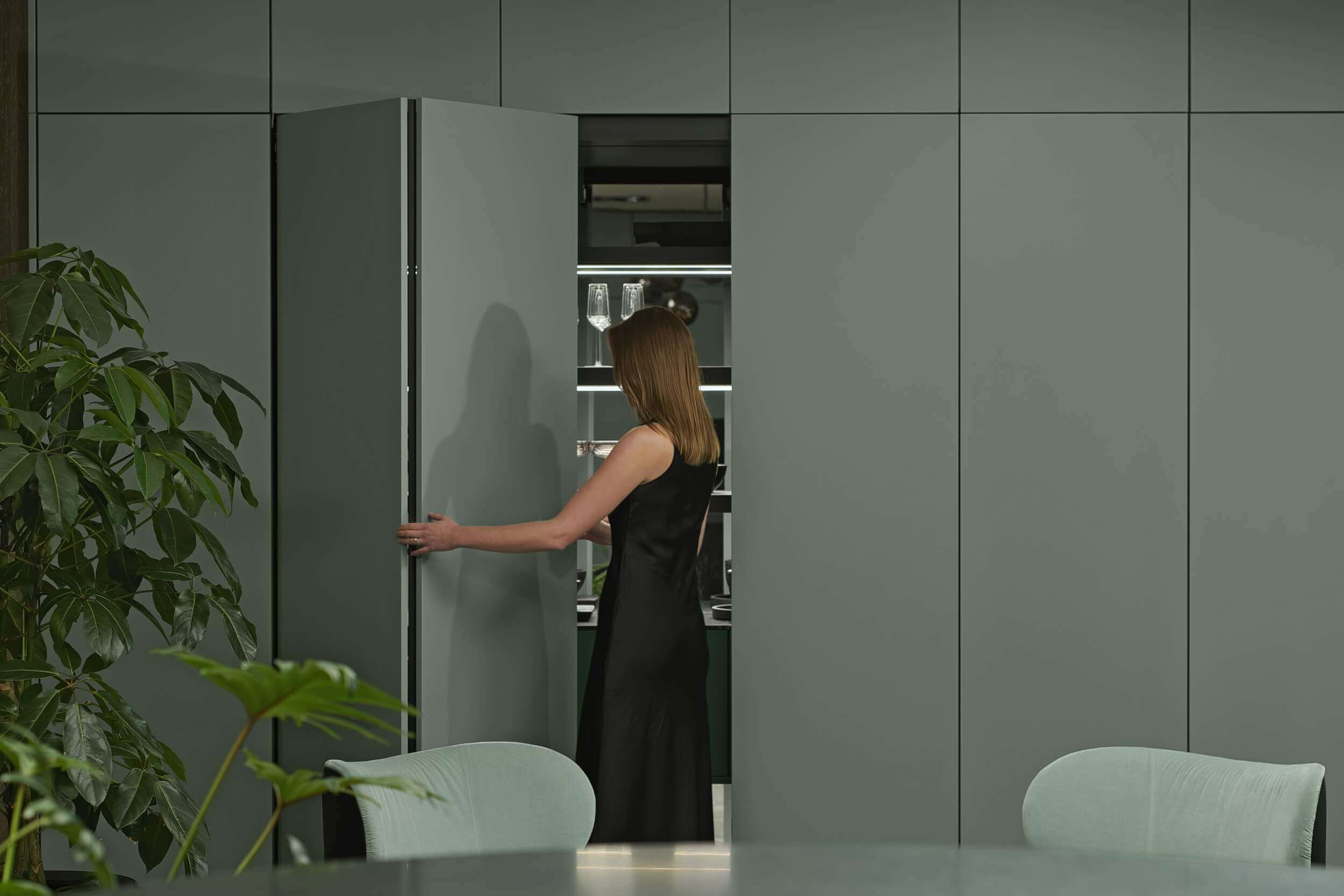 Place pantry volumes on the shortest route between fridge, prep and sink, and set internal shelf heights to the actual items stored. When doors close back into the cabinet line, the working zone returns to visual calm.