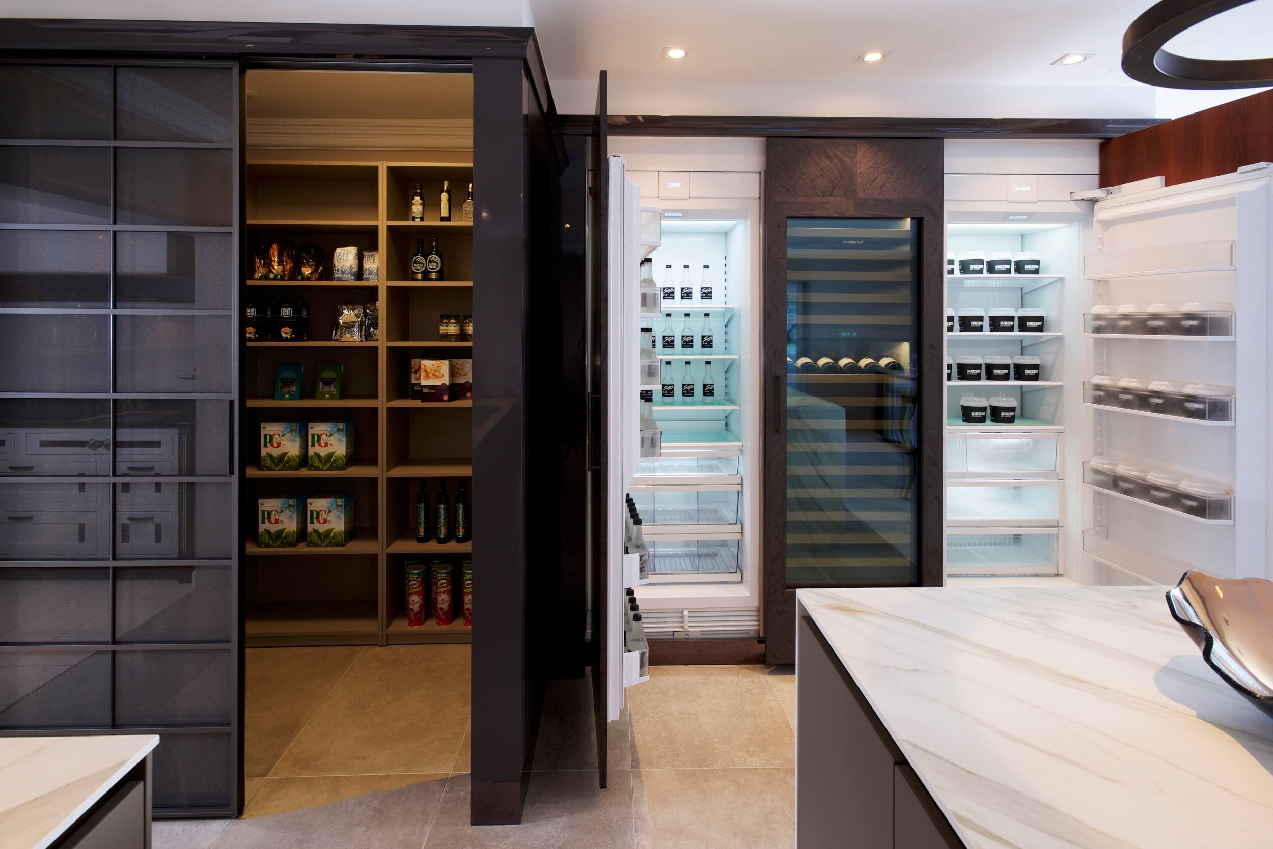 Within Dream Design’s luxury bespoke kitchen design service, storage planning is resolved as part of the set-out—internal volumes mapped to routine, clearances held at the point of use, and joinery lines kept quiet so worktops remain usable day after day.