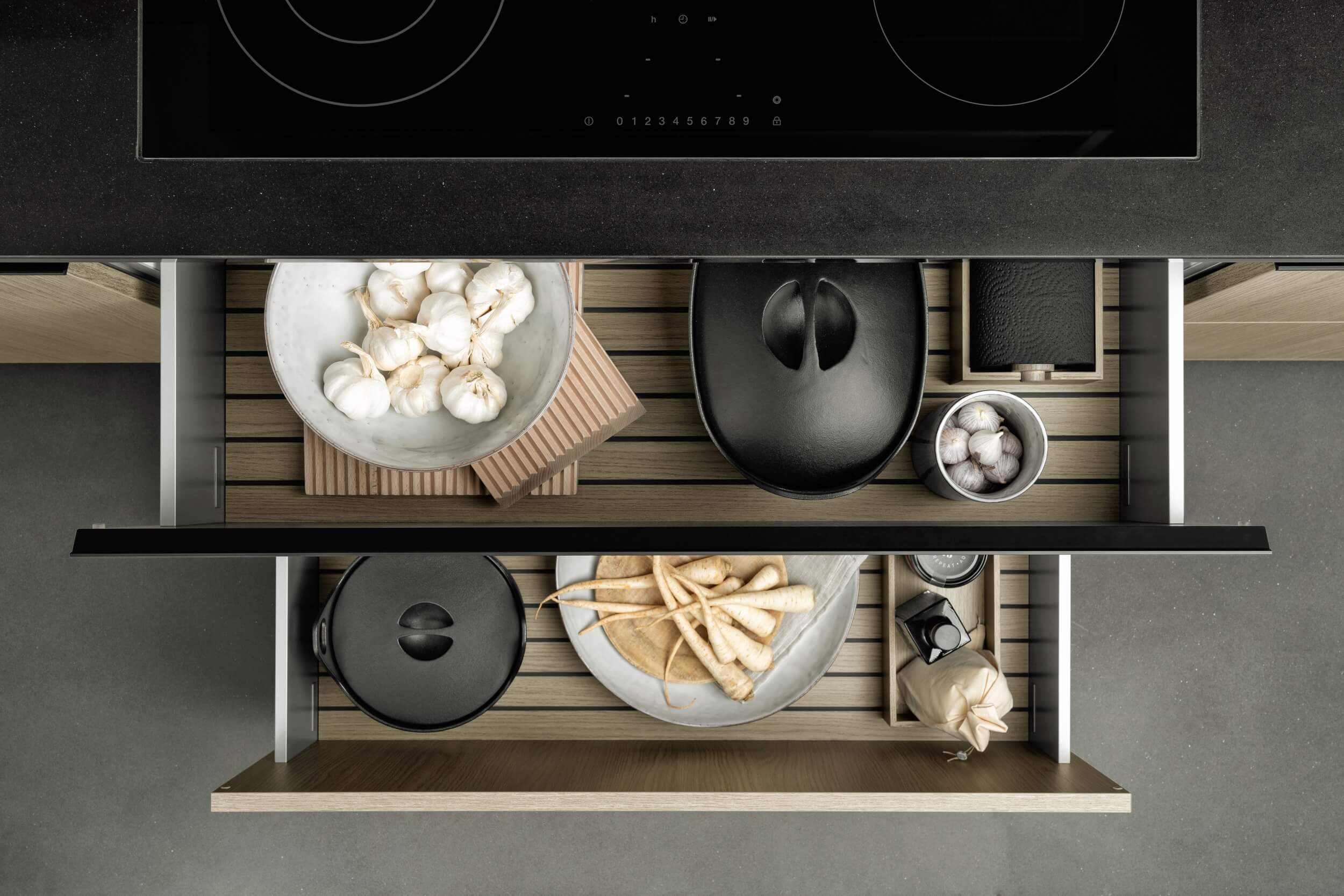 Allocate deep drawers around prep tools, pans, spices, oils and tableware, then place them exactly where the routine happens—prep height near prep, heavier items near hob and ovens.
