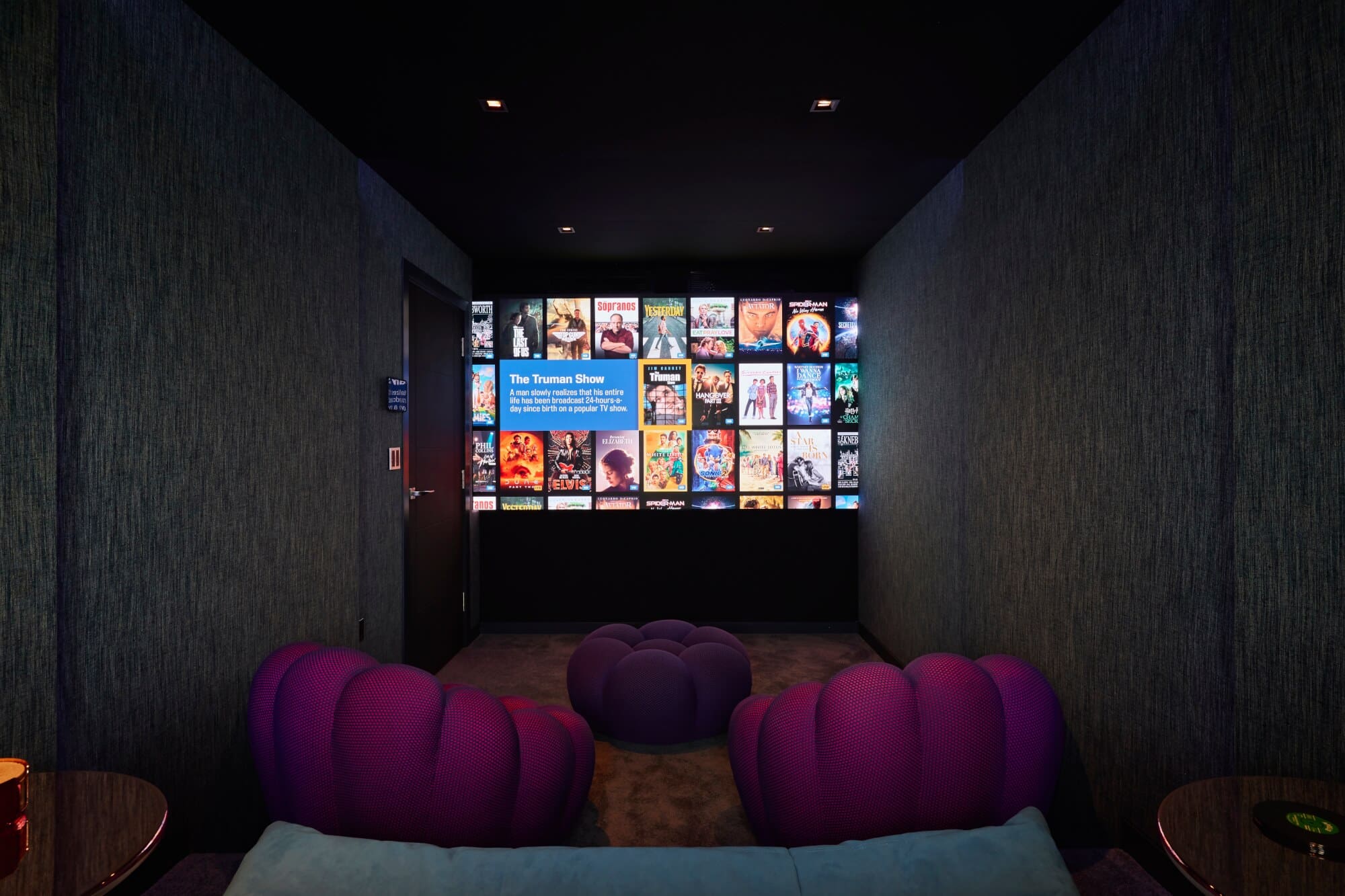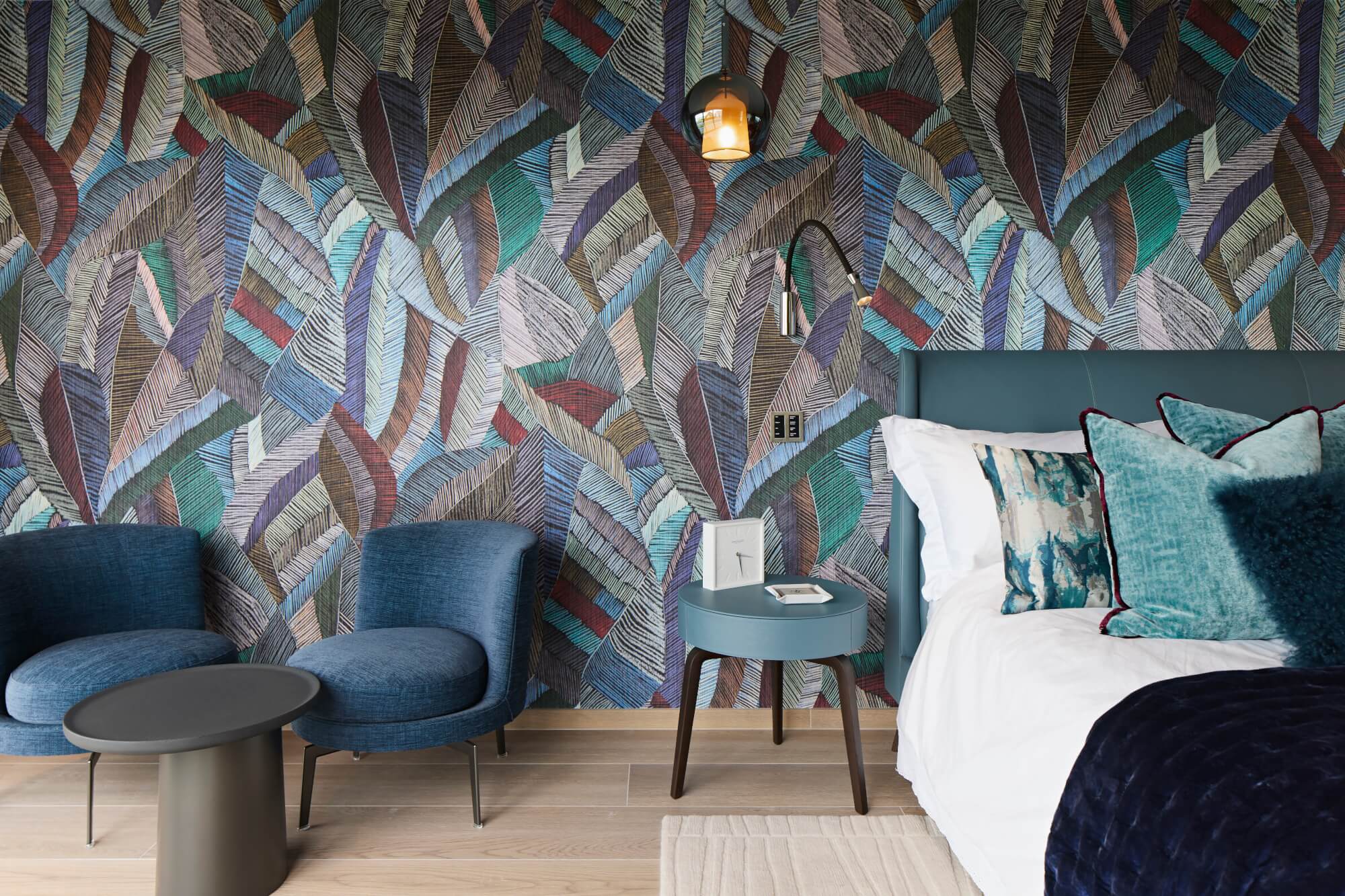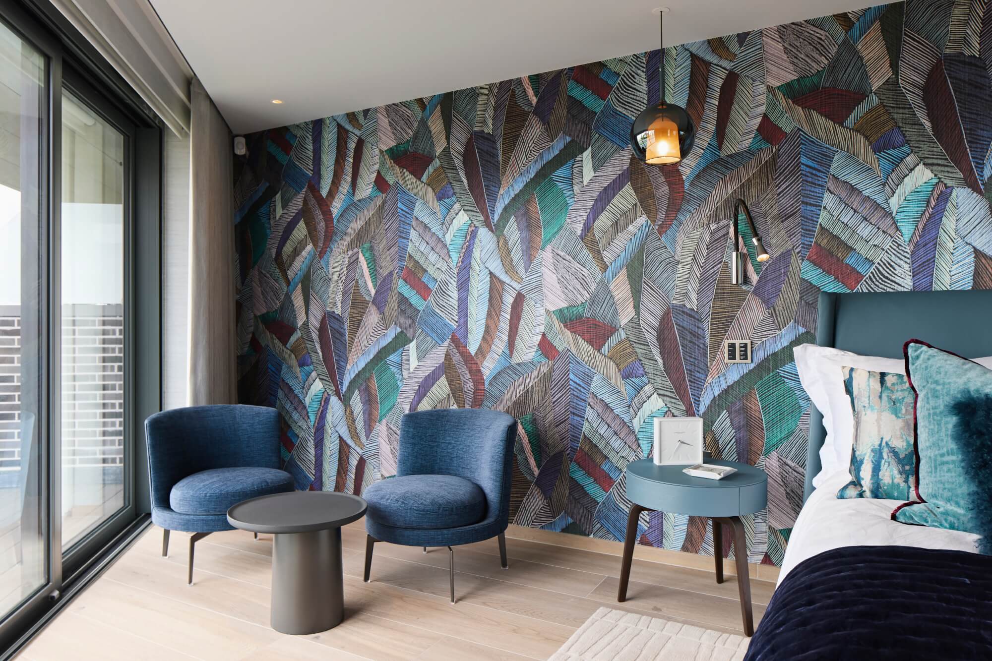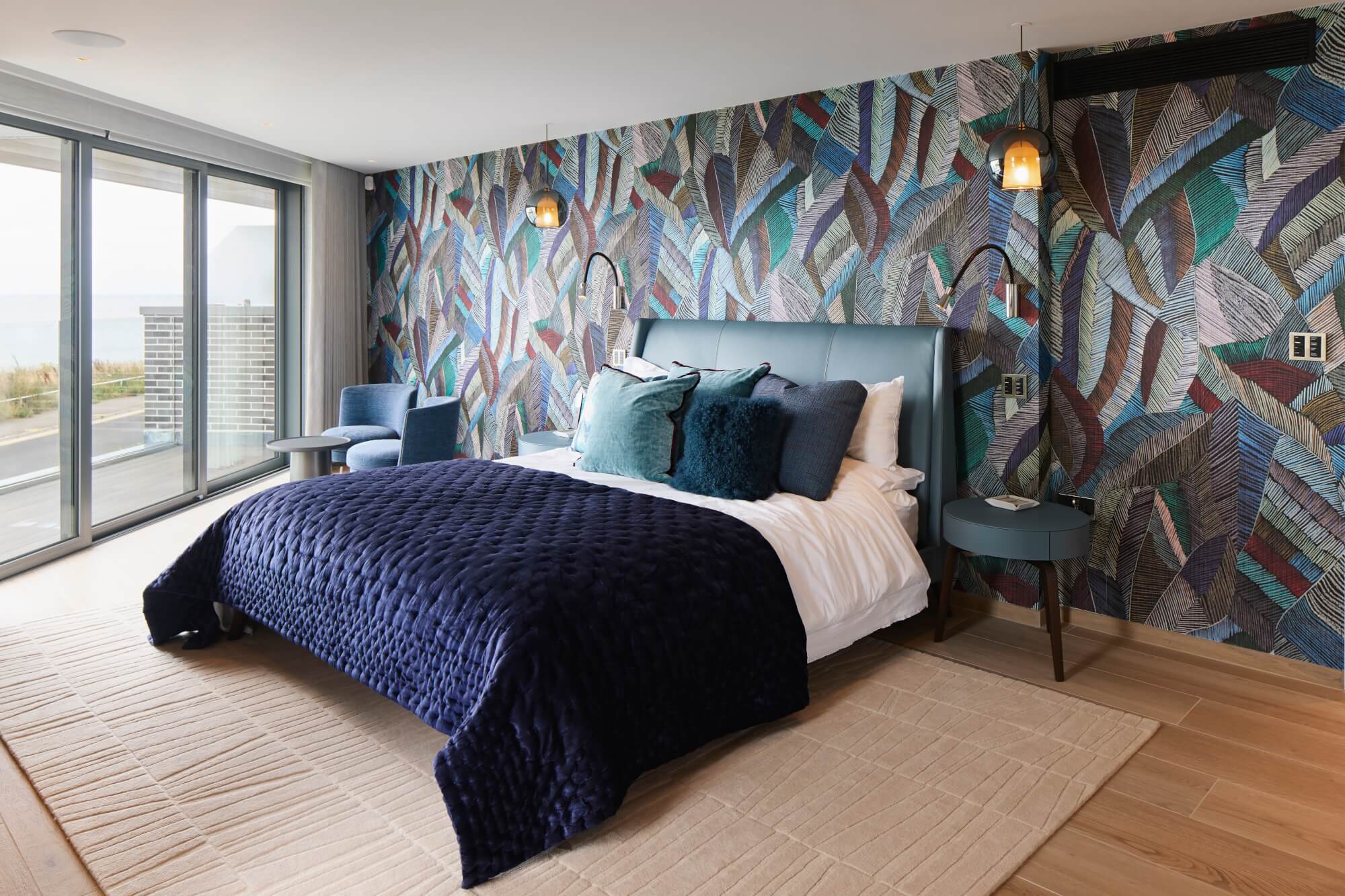 Blue tones from the statement headboard wallpaper are carried into the leather bed, side tables, and swivel armchairs, maintaining a cohesive, restful palette. A bespoke rug, patterned with a subtle reference to sand viewed from the balcony, anchors the room and ties the interior back to its landscape.