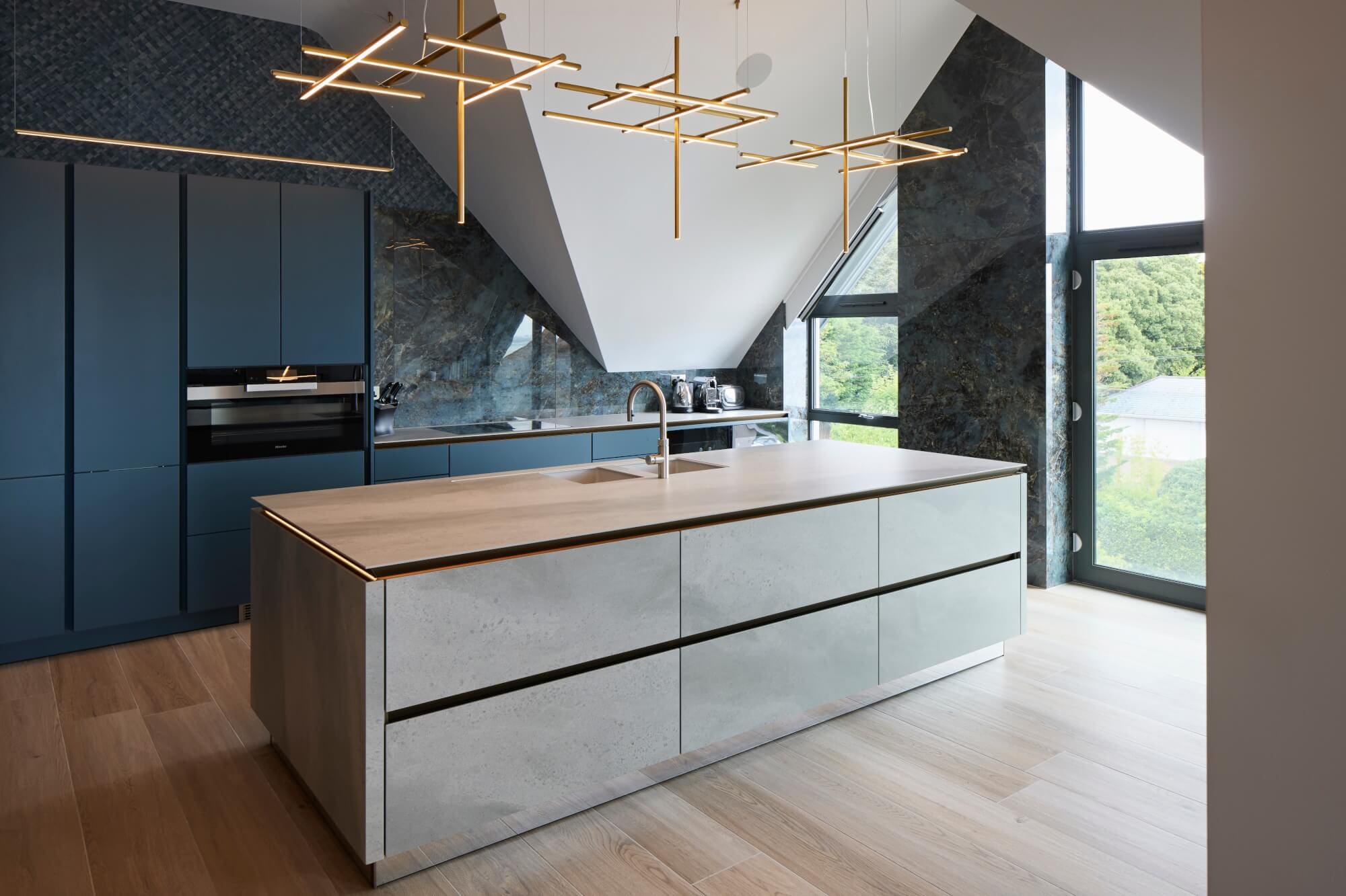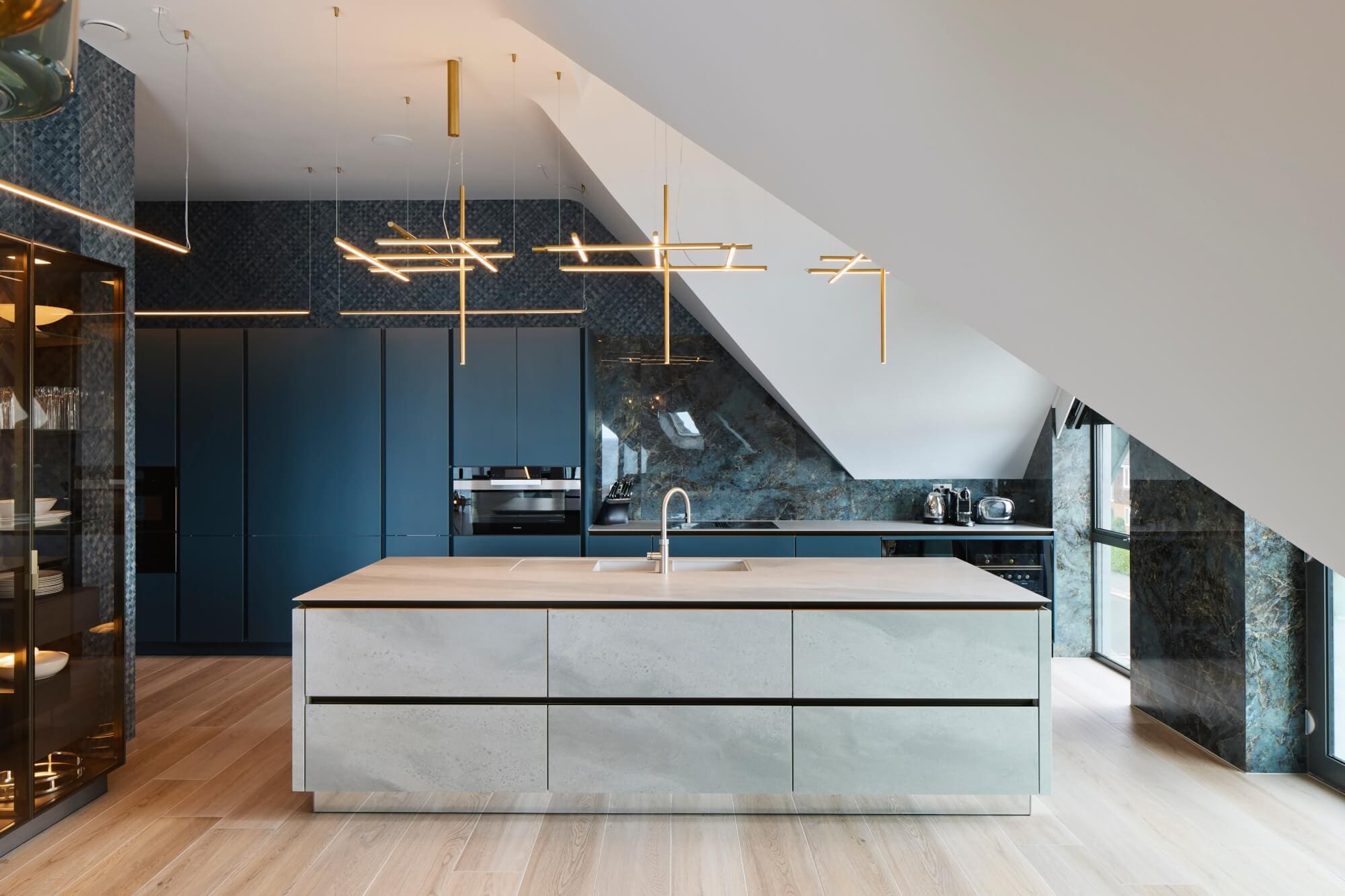 Whitewashed ash wood-effect porcelain flooring runs throughout to maintain material continuity, paired with matching internal doors and staircase finishes. SieMatic SLX cabinetry in Hamptons blue is balanced with porcelain surfaces: marble-effect cladding to the hob wall and window surrounds, and light grey stone-effect porcelain to the island fronts and worktop. The result is a composed palette with crisp set-outs and a durable finish suited to coastal life.