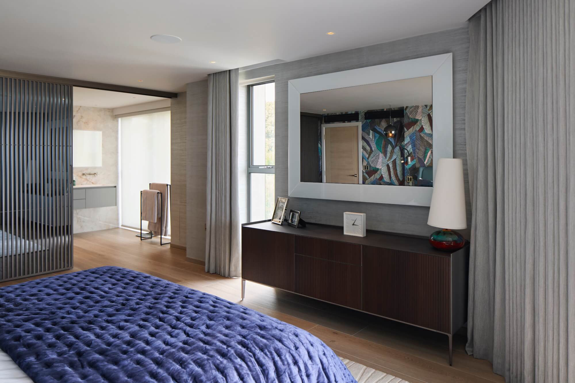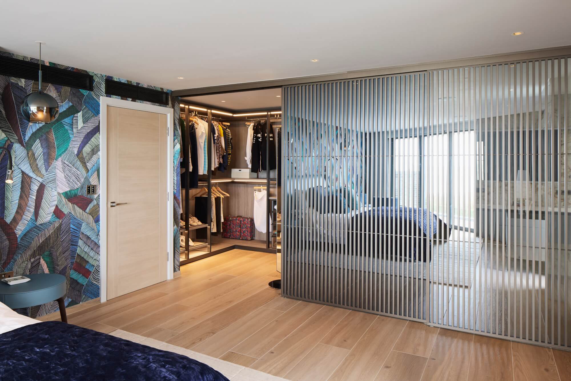 A panelled feature wall in vertical fluted bronze with mirrored strips conceals sliding panels, revealing a walk-in wardrobe and ensuite shower room while keeping the main elevation quiet and ordered.