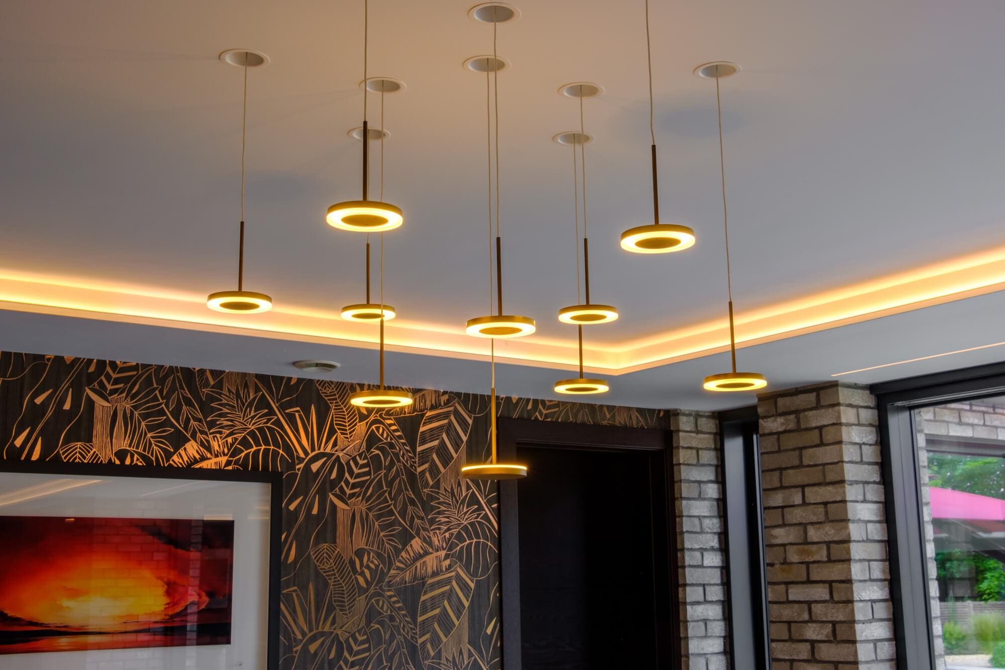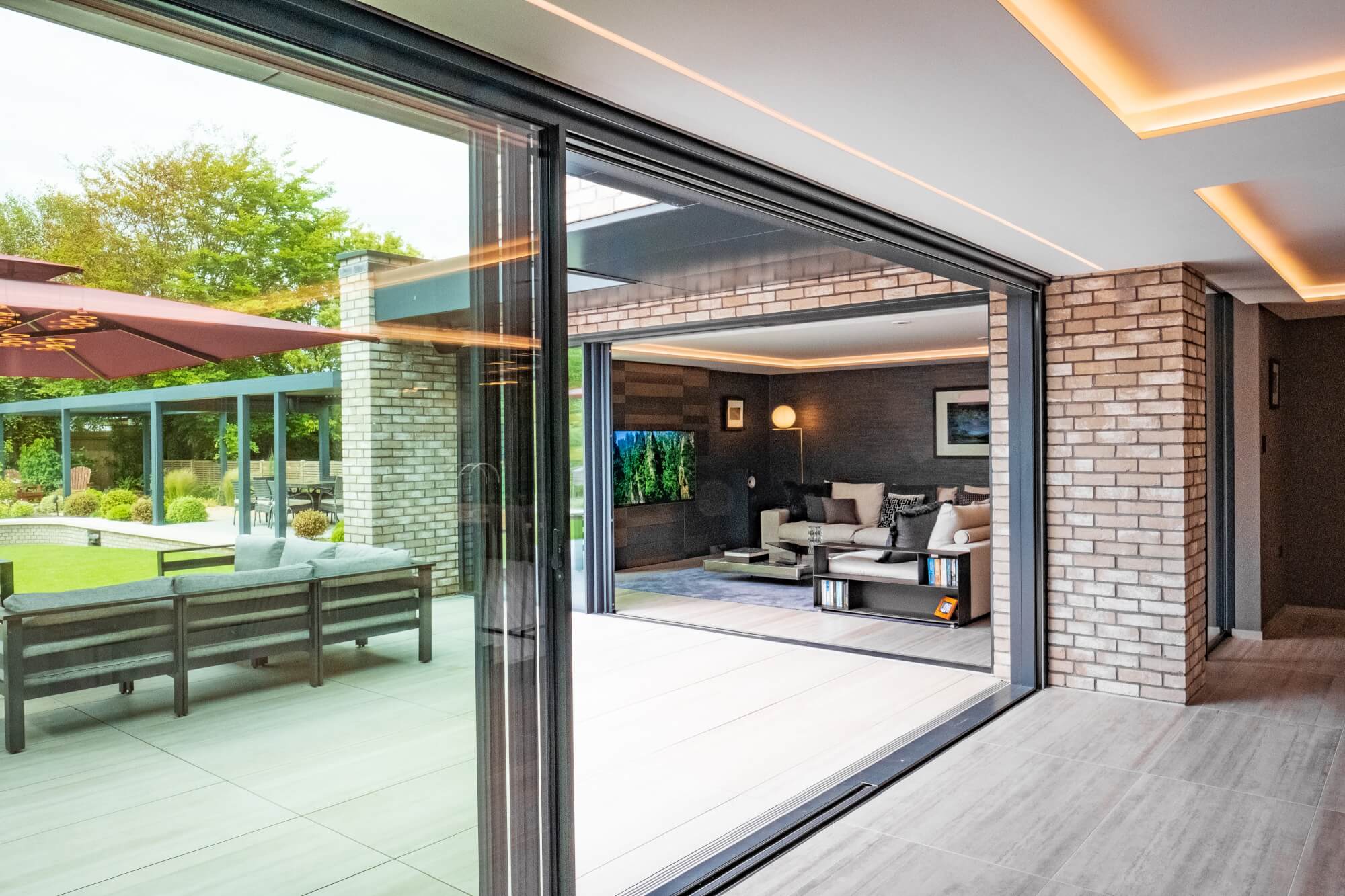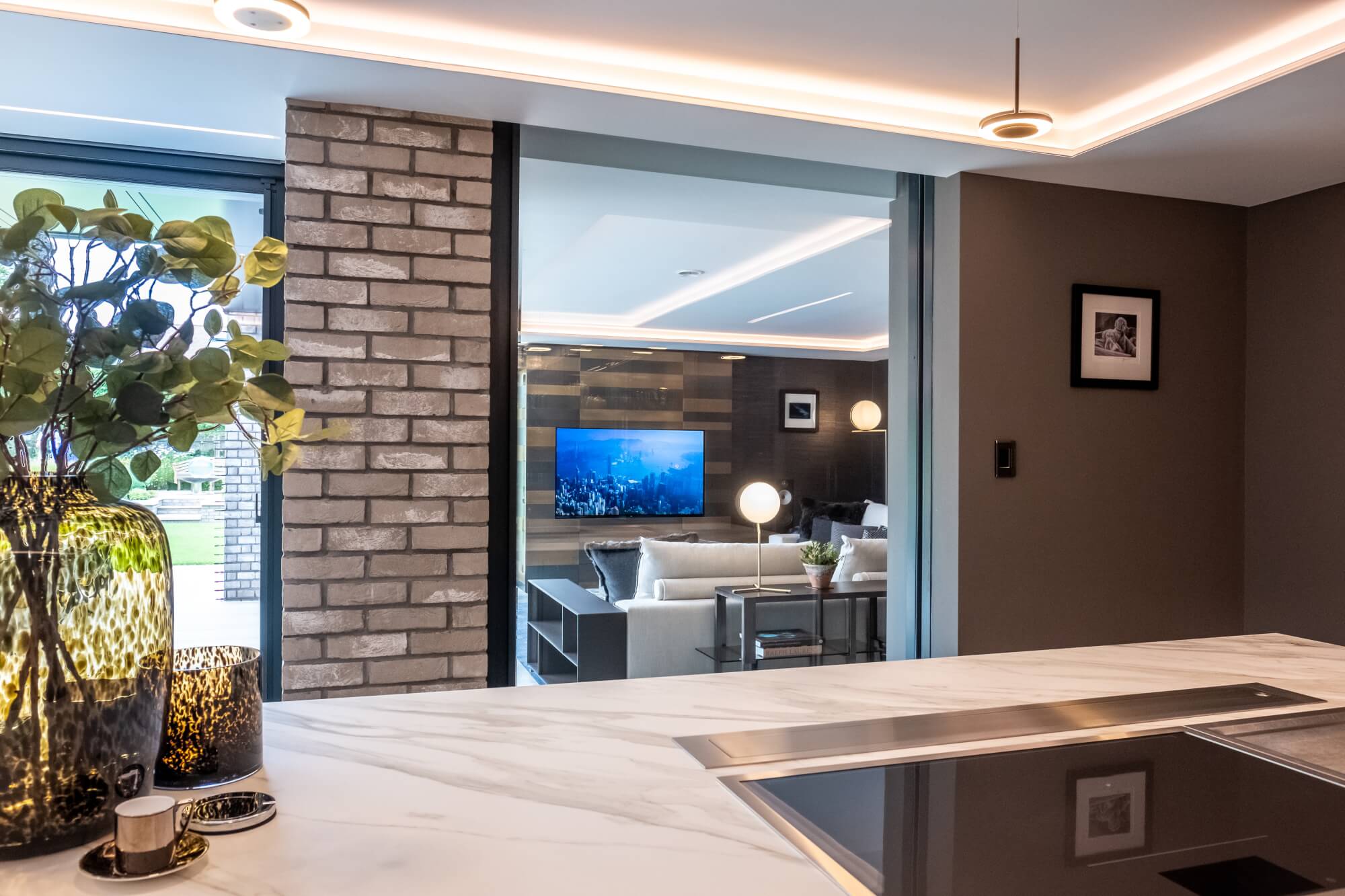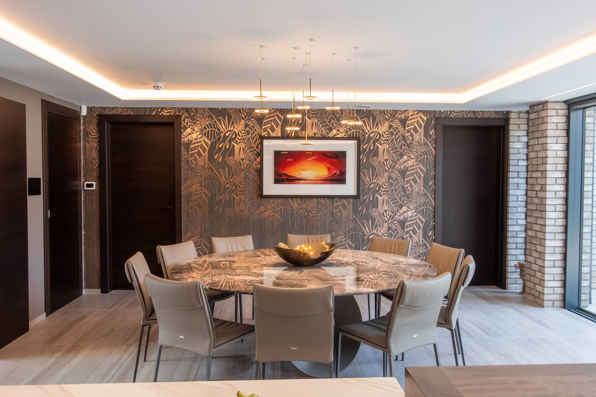 In the lounge, a corner sofa forms a relaxed centre, while porcelain floor tiles carry from the kitchen through to the terrace for a seamless threshold. Horizontal textured wallpaper and a hand-burnished metal TV surround with concealed storage introduce warmth and depth without visual noise.