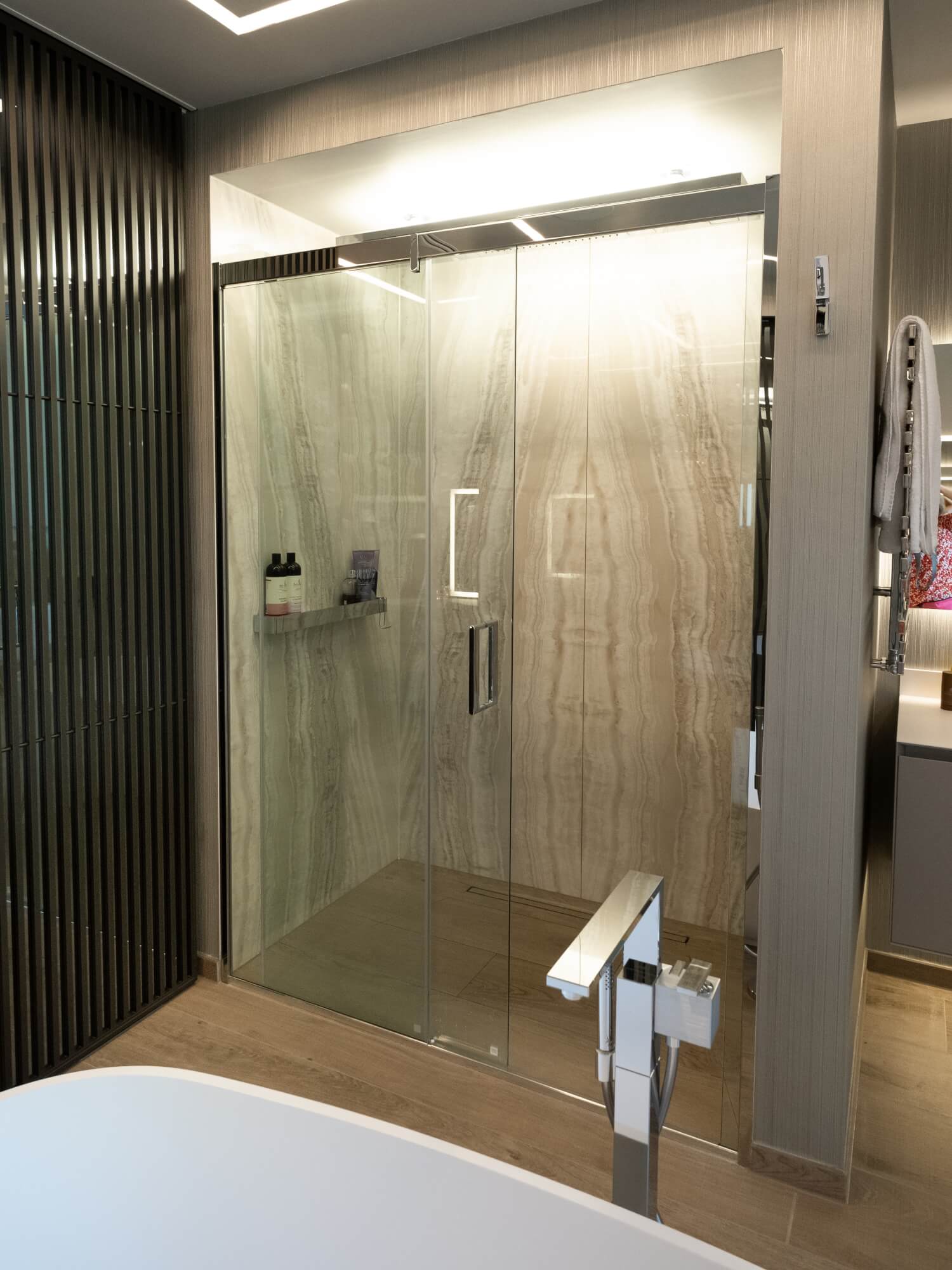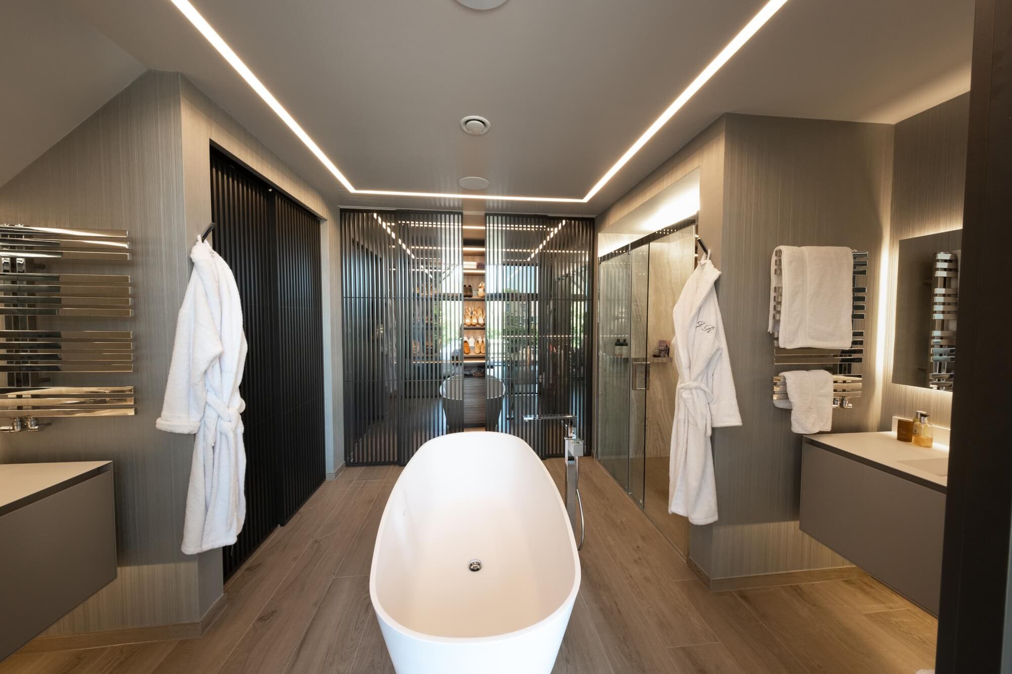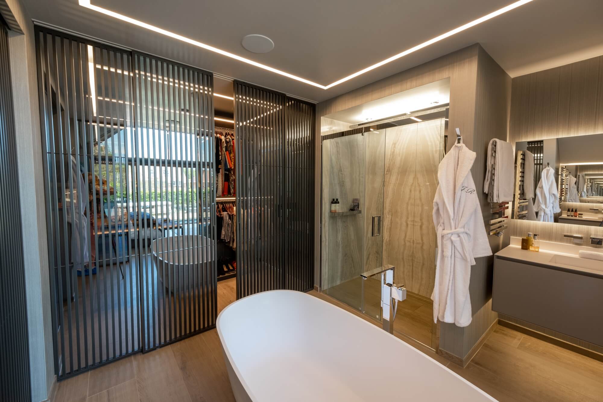 Rimadesio reflective glass doors balance openness and privacy between bedroom, ensuite, and dressing room. The ensuite is composed around a central freestanding bath, paired vanity units, and a generous shower with book-matched marble-effect walls, set out to read as one surface.