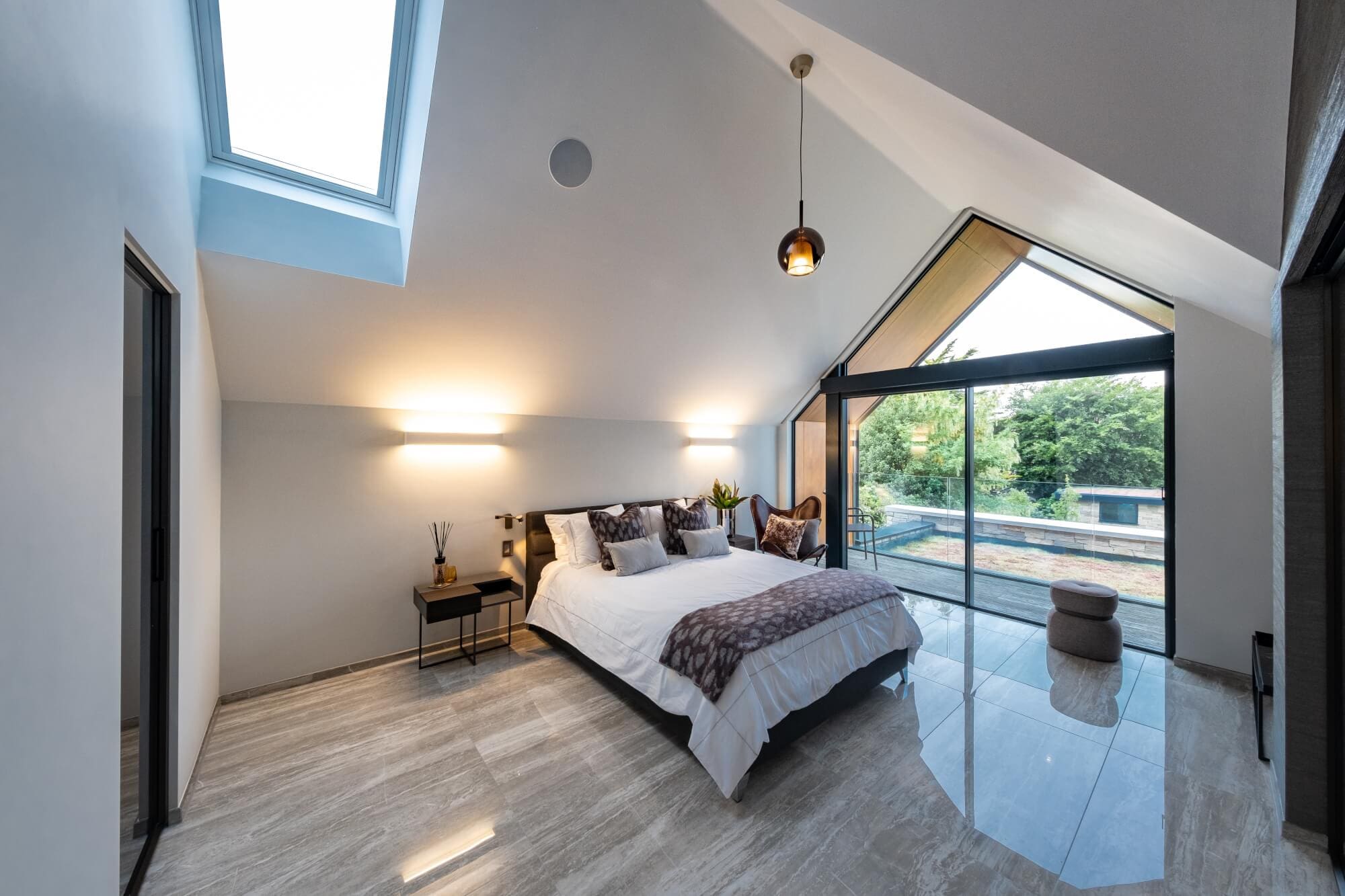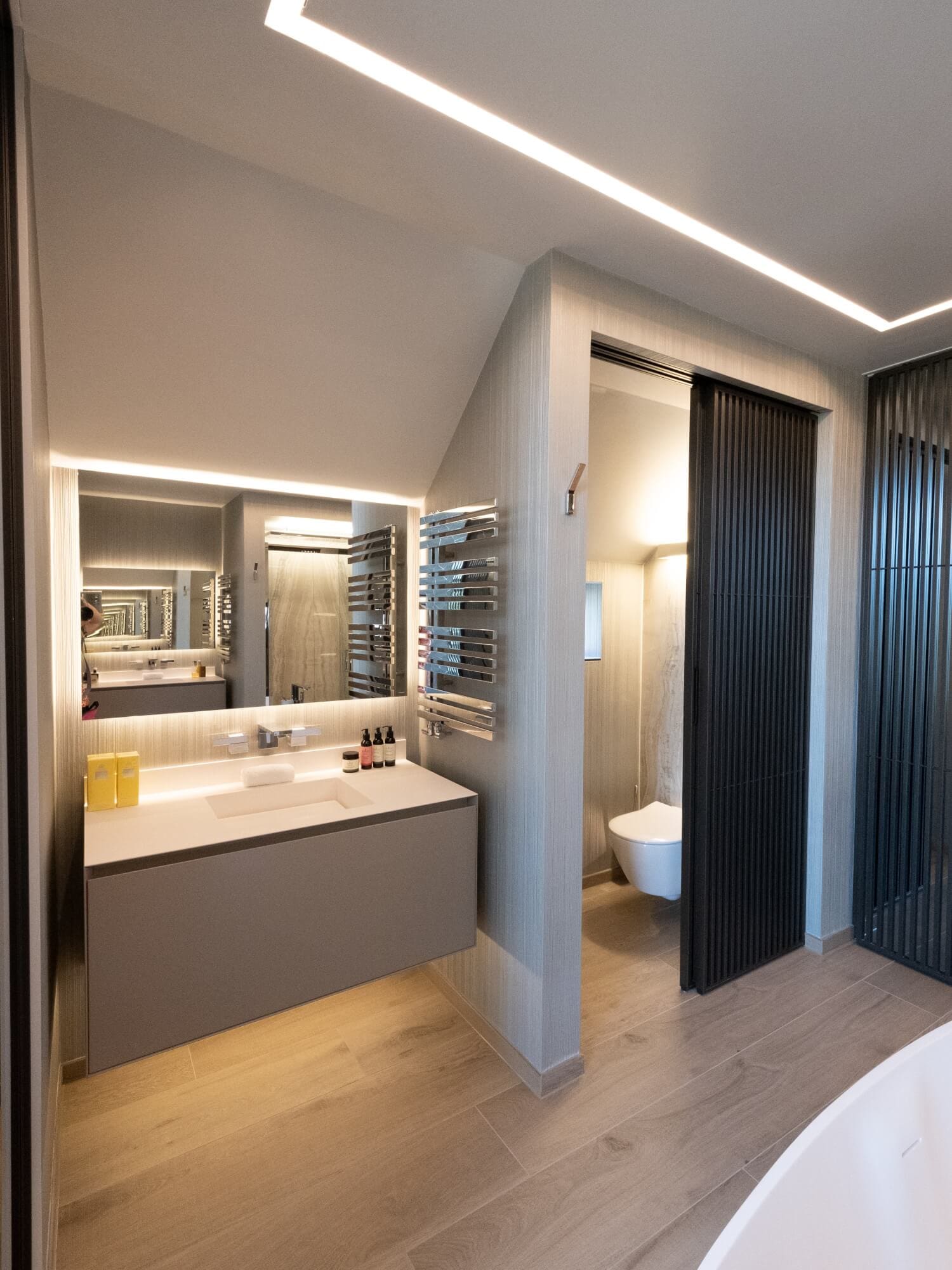 This integrated approach allowed Dream Design to develop the complete home design across kitchen, bedrooms, and bathrooms, with lighting schemes and finishes set out to maintain continuity and calm throughout the house.