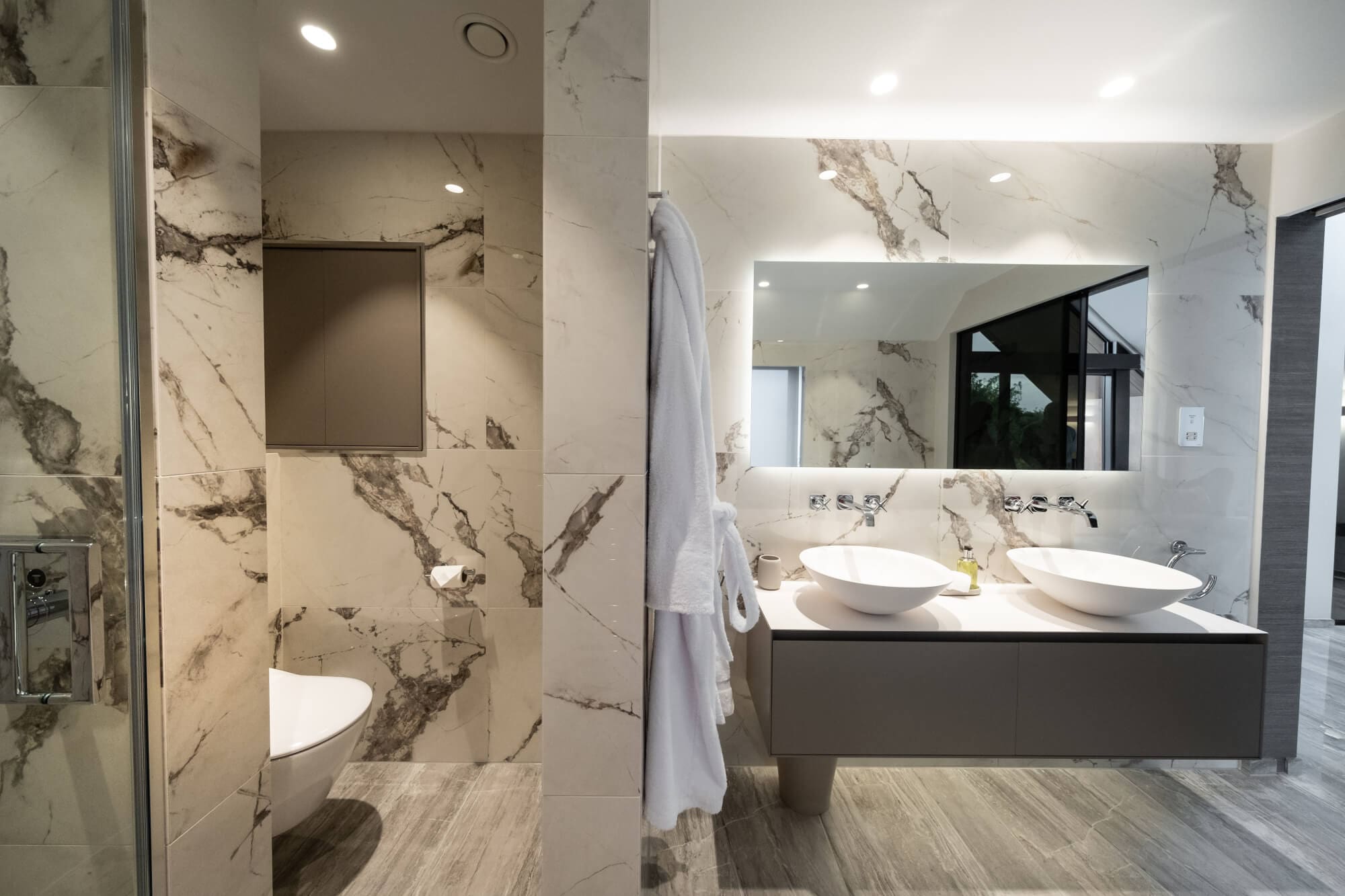 Polished marble-effect wall tiles are paired with honed stone-effect flooring, extended into the bedroom to keep material transitions calm. A concealed WC allows the double vanity with sculptural basins and wall-mounted taps to sit as the focal element, keeping the room functional and visually ordered.