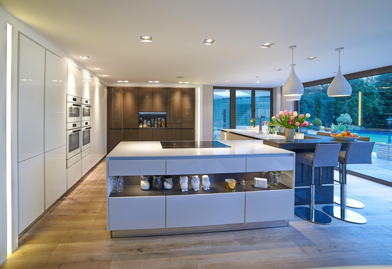 Work surfaces in Silestone Blanco Zeus provide a crisp and durable base, perfectly complementing the glossy cabinetry. Bespoke breakfast bar and niche linings in Neolith Piatra Grey add texture and warmth, creating a balanced contrast. Stylish and comfortable KFF Texas bar stools complete the space, making it both a hub for family connection and a showcase of contemporary design.