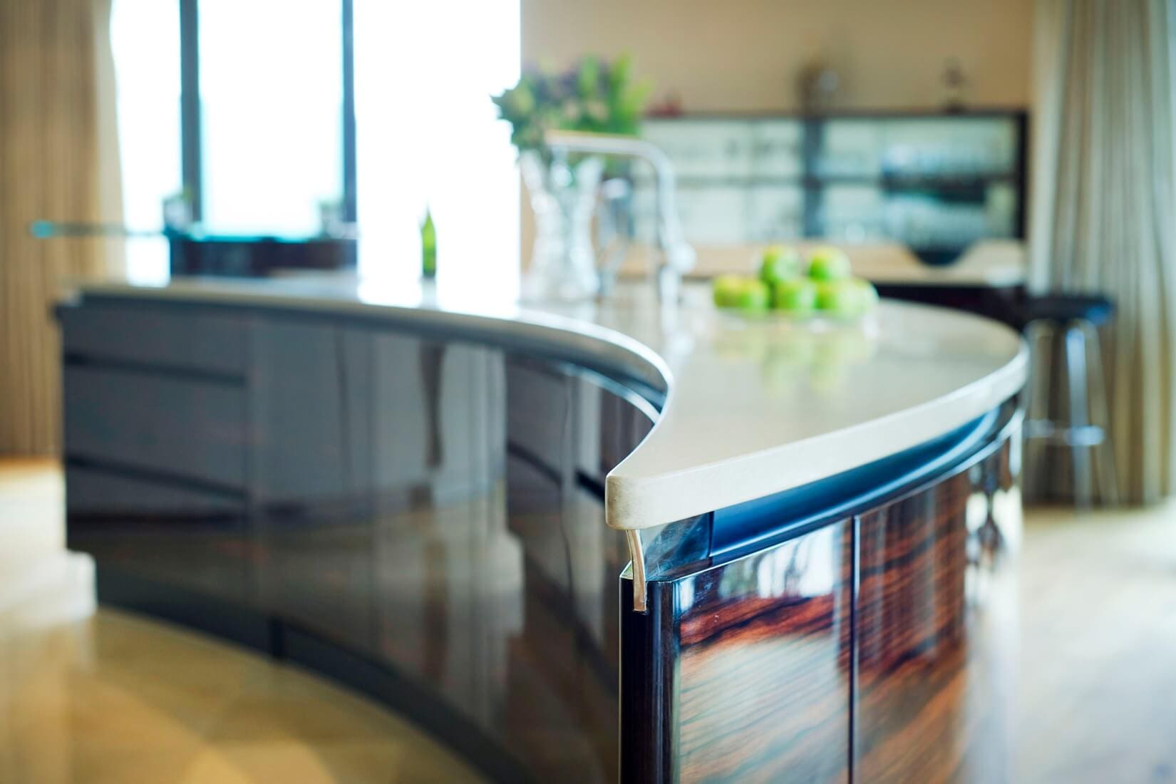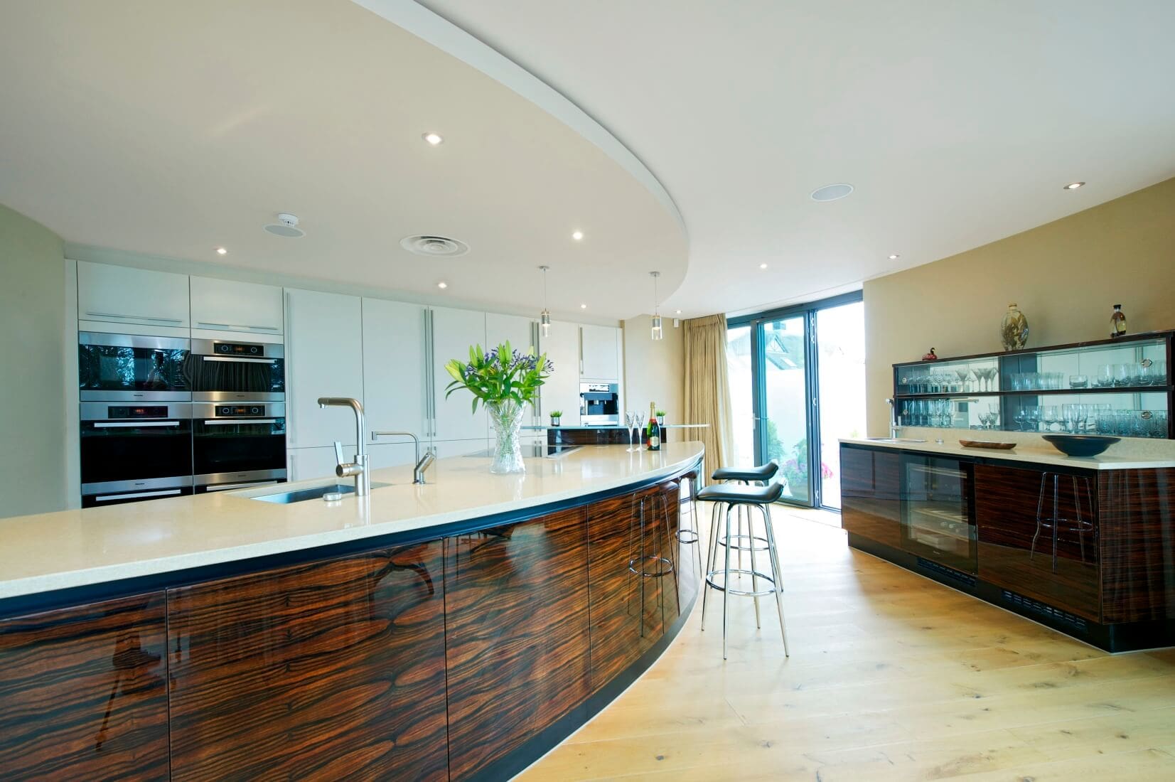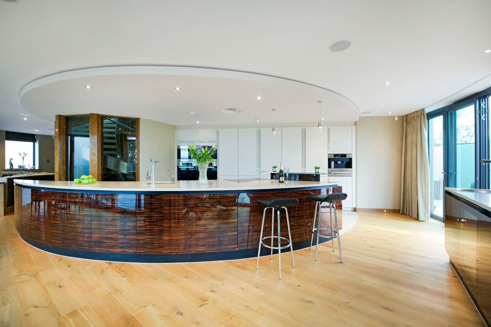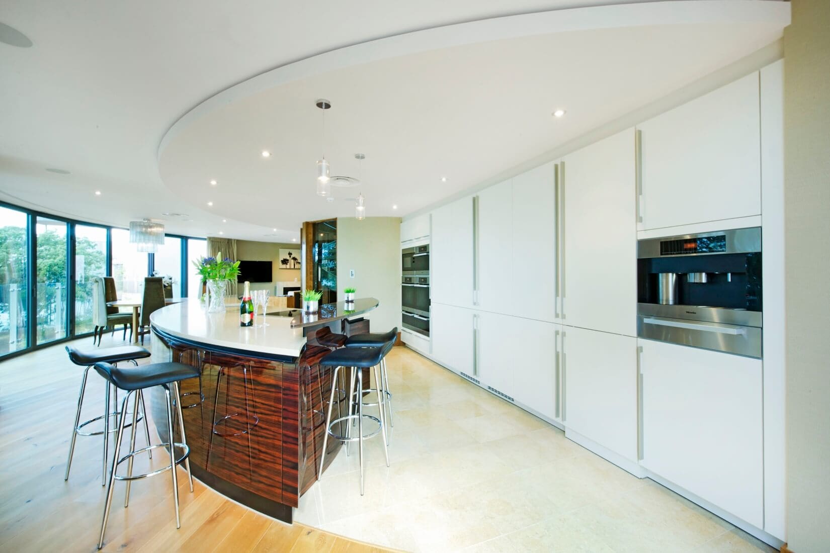 Bespoke cabinetry was crafted to resemble a windsurf sail, with an elevated breakfast bar representing the board. The illuminated bulkhead above the island and the transition from tiled to wooden flooring emphasise the island’s unique shape.