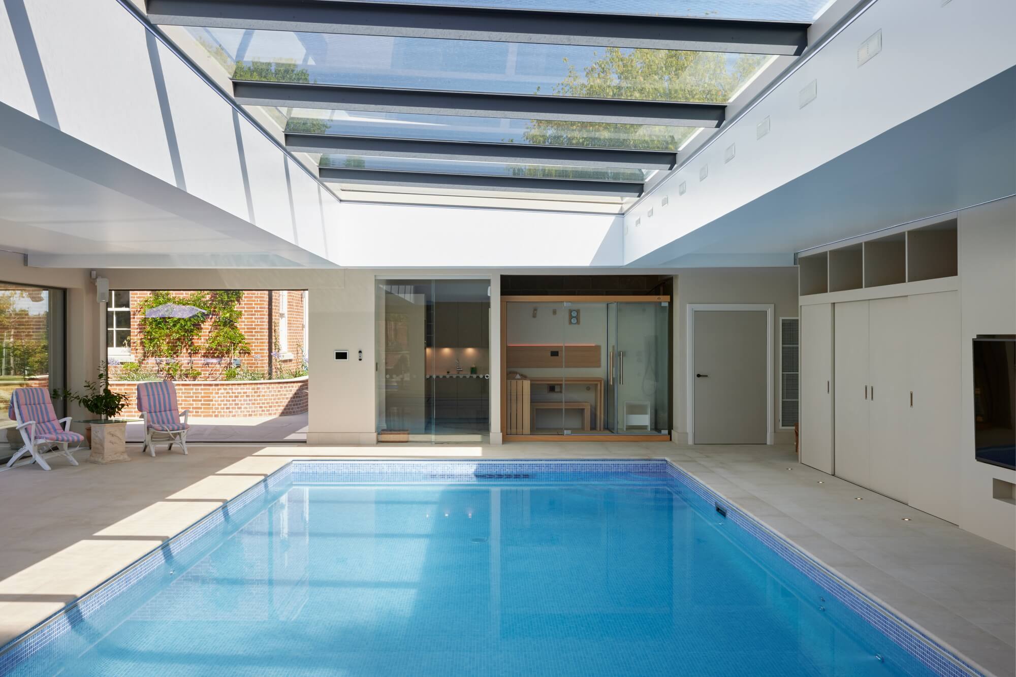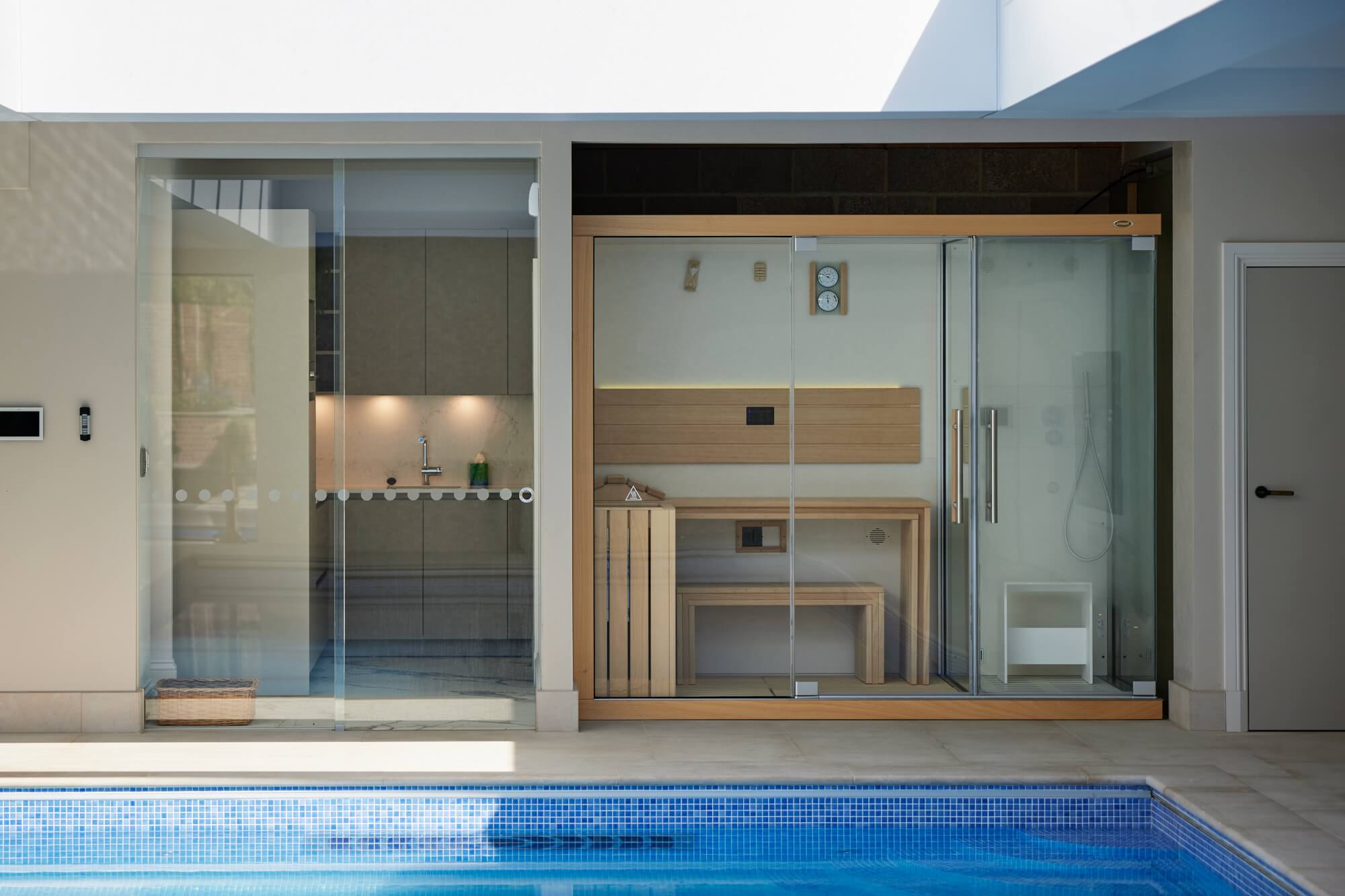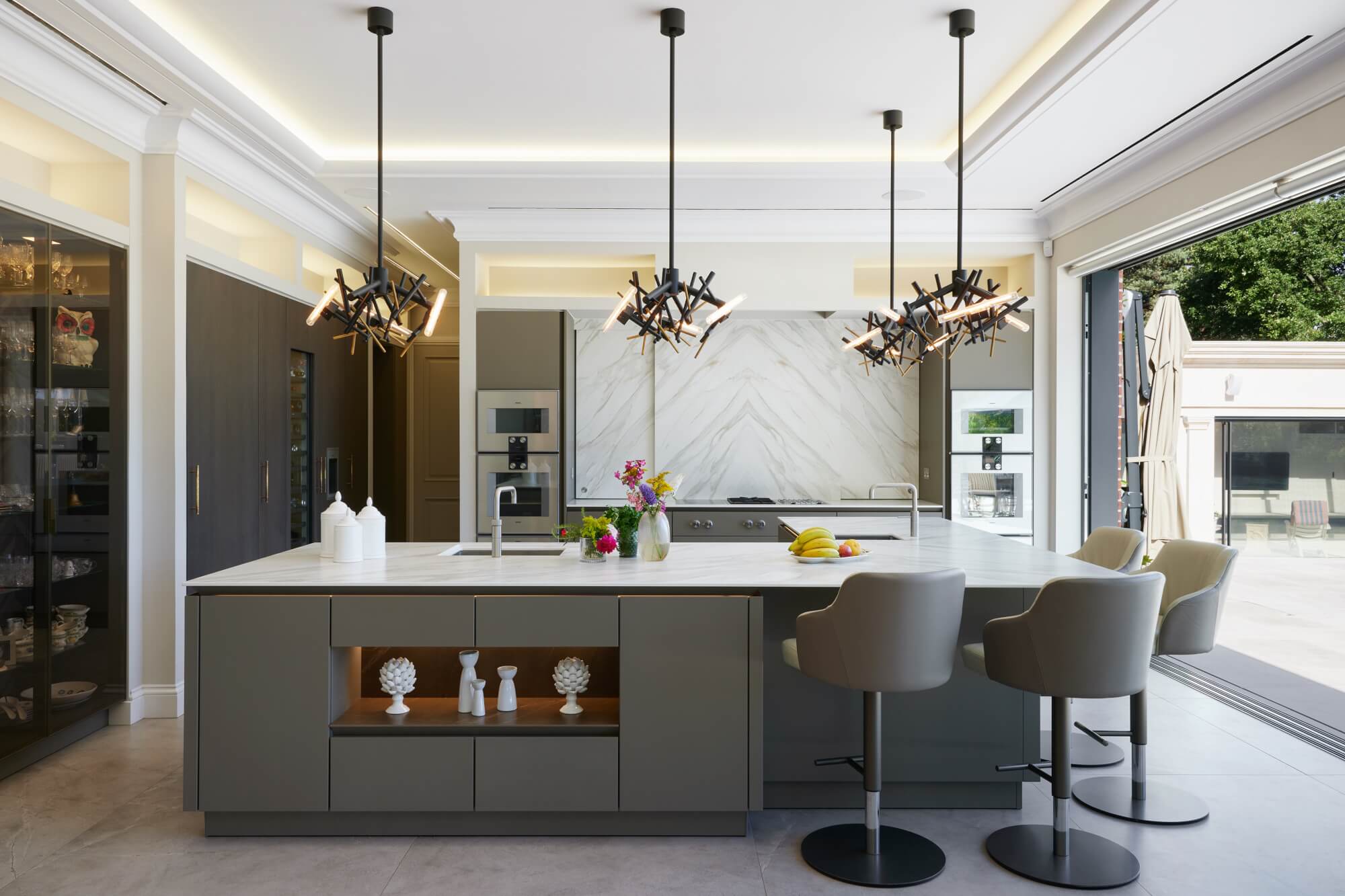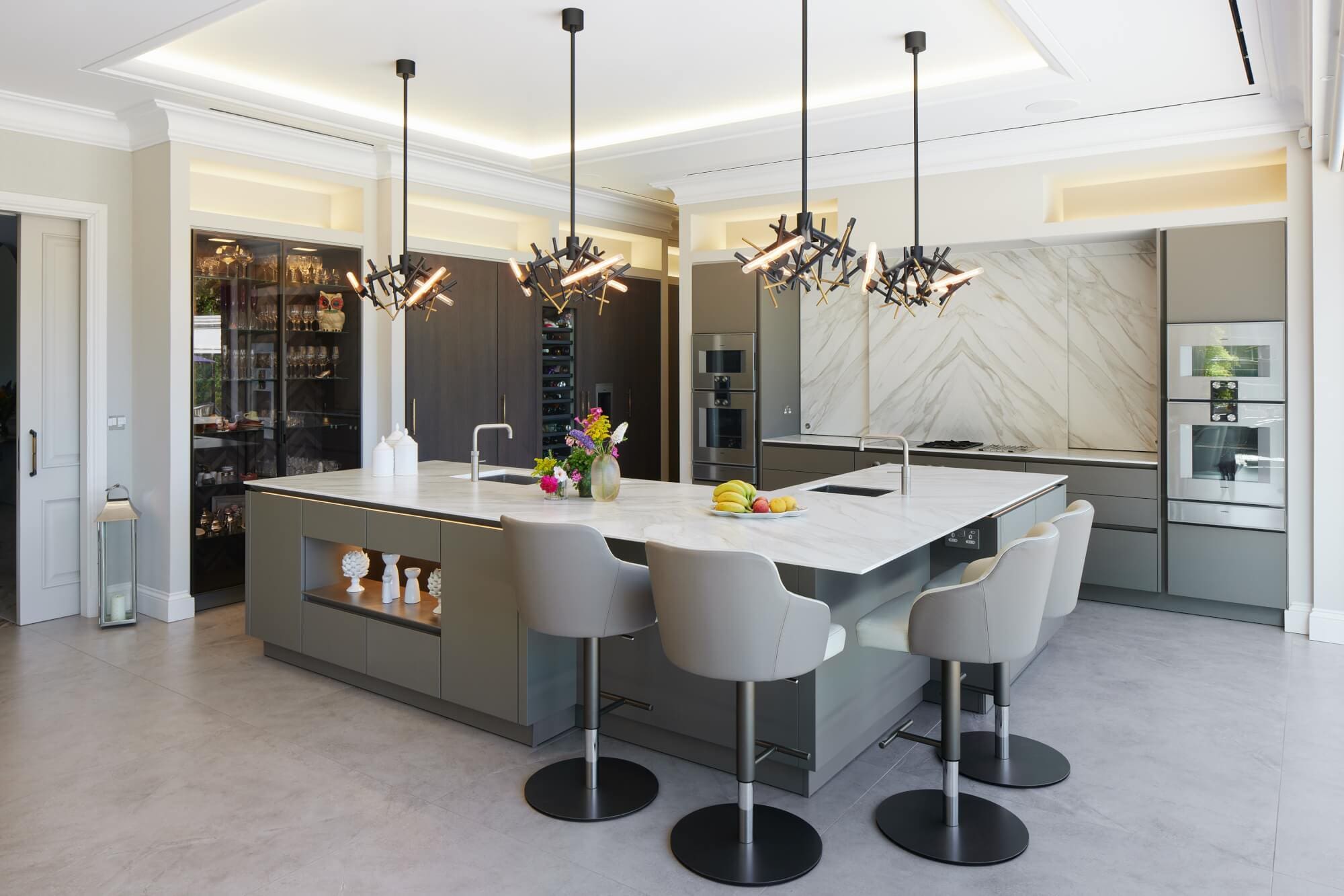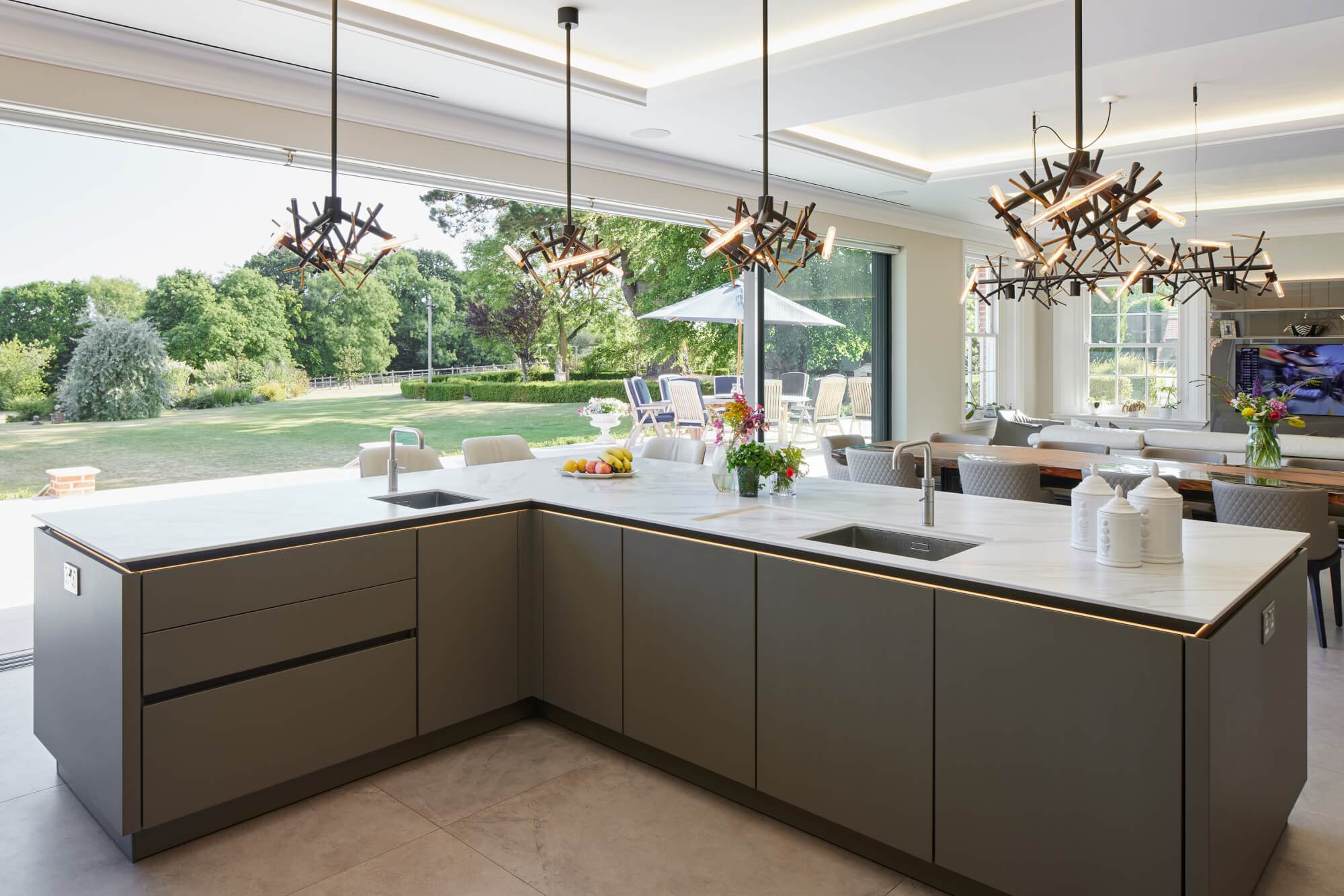 The kitchen is specified in SieMatic Pure, composed as a clean architectural elevation with integrated storage and a calm material rhythm. A bespoke ceiling design, formed of three raised sections with concealed LED lighting, defines the kitchen, dining, and lounge areas without visual division. An L-shaped island anchors the space, set out to support natural movement and connection while framing views towards the terrace. Cabinetry selection and detailing follow Dream Design’s considered approach to SieMatic kitchens, where geometry, alignment, and longevity guide specification.