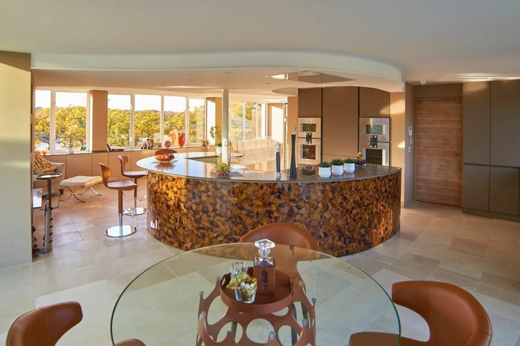 The SieMatic kitchen is planned as a sociable, multi-functional hub, centred on an L-shaped island that integrates a structural column without interrupting circulation. The layout naturally forms zones for casual dining, formal meals, and lounging, supporting easy hosting and day-to-day living. A bespoke drinks area adds convenience while keeping the primary kitchen workflow clear.