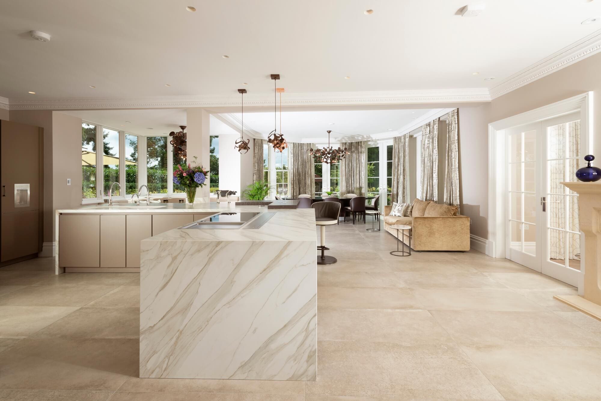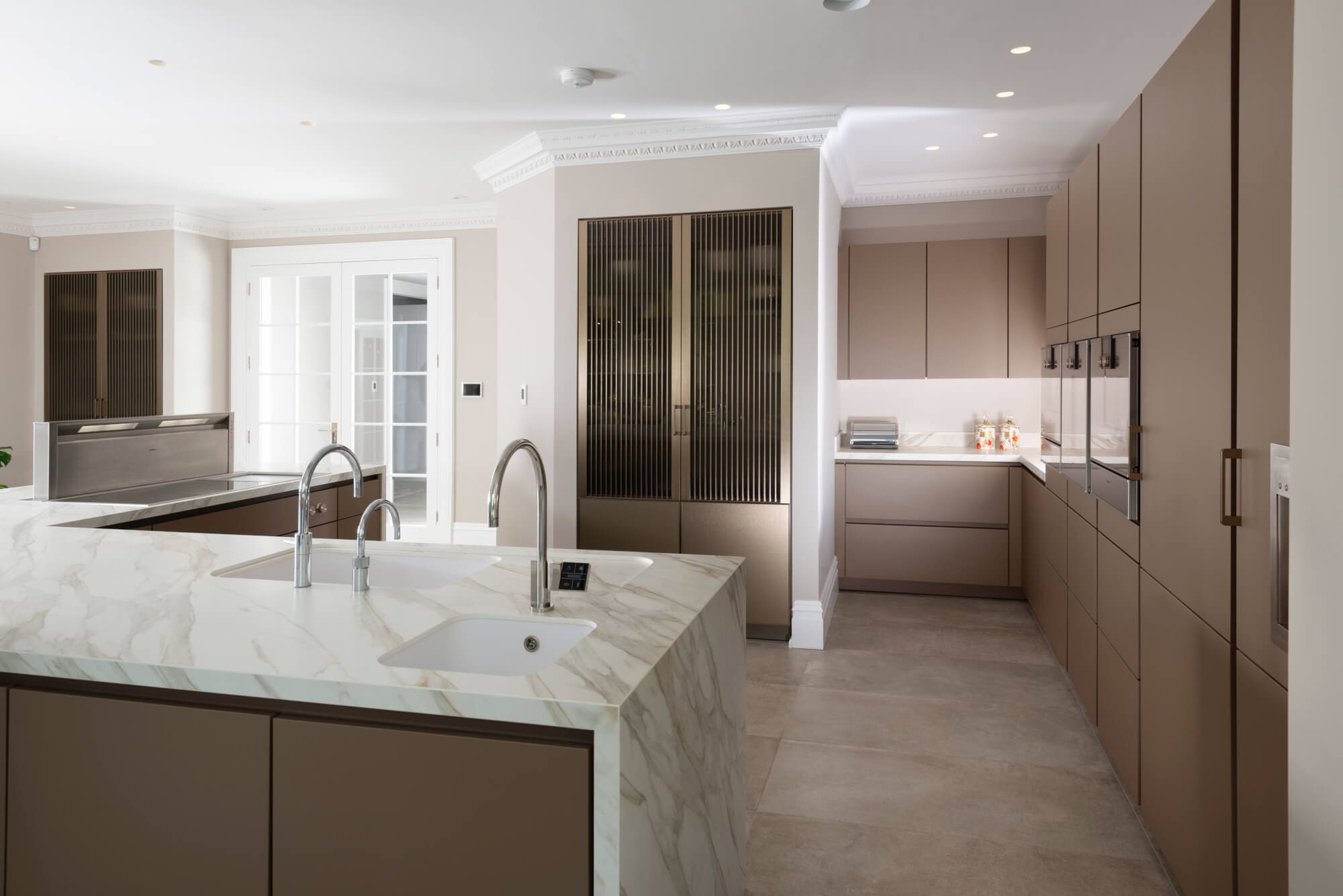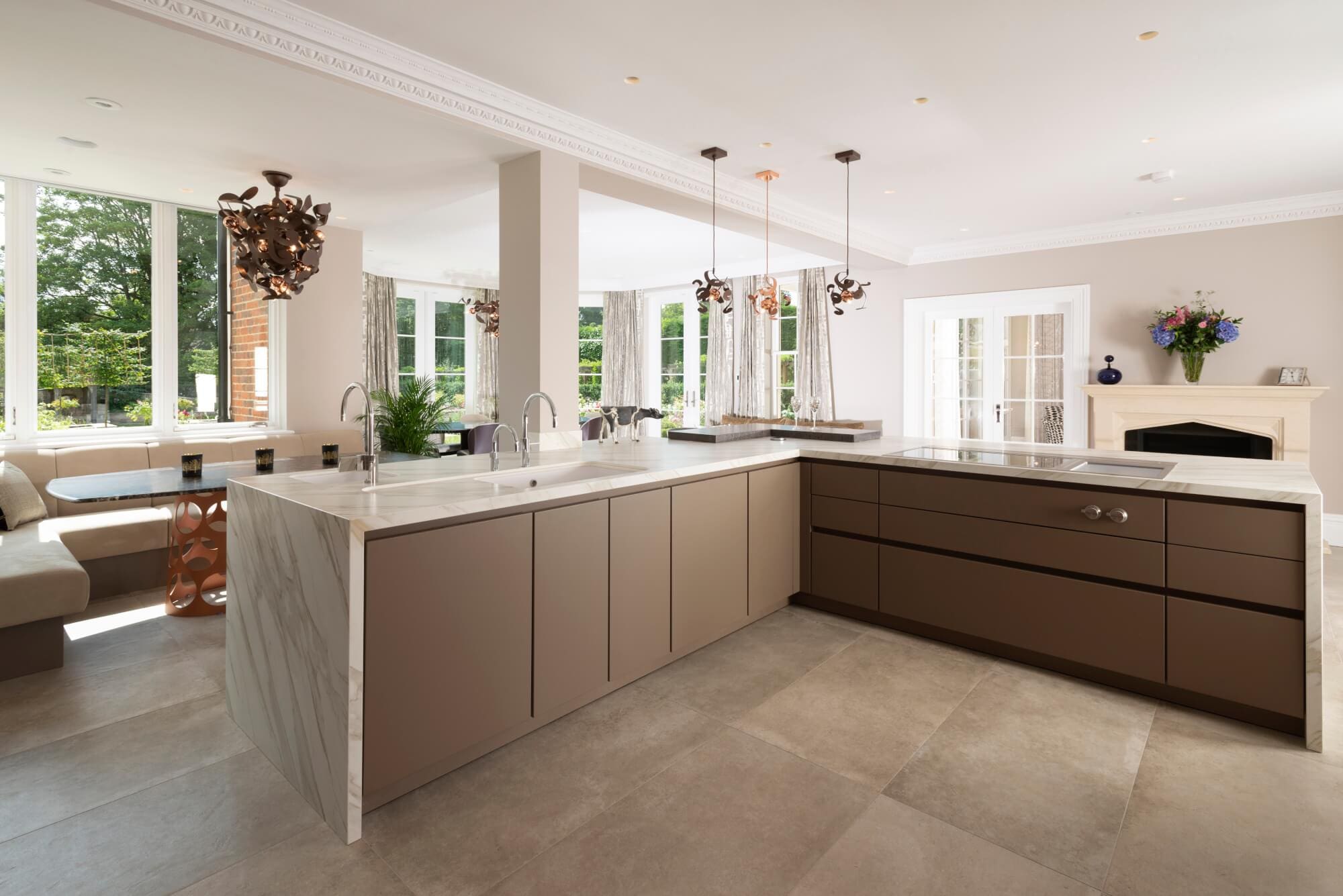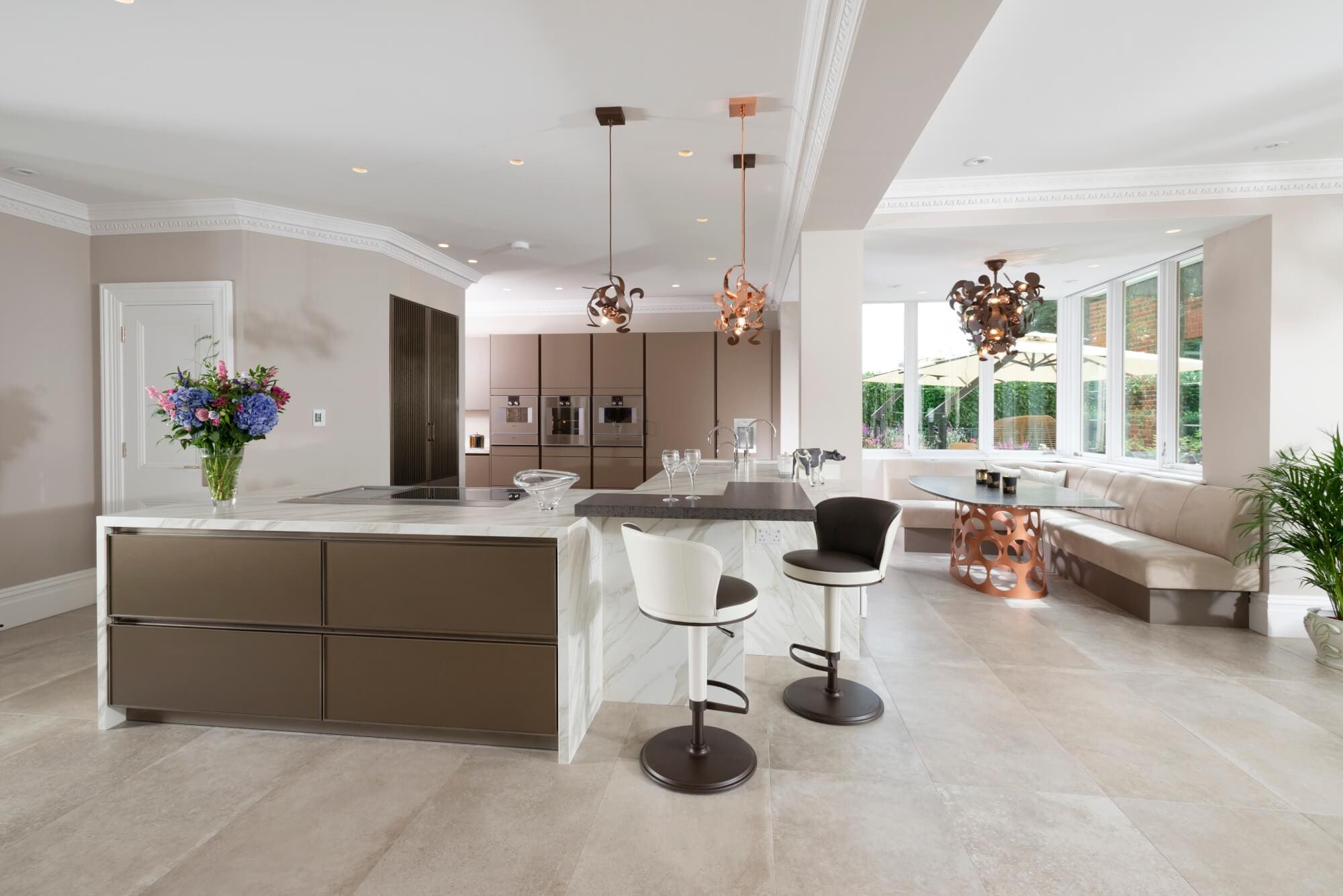 Cabinetry in Nutmeg matt lacquer with Gold Bronze accents is paired with book-matched Neolith Calacatta Gold Silk worktops, detailed with mitred panels and end-matched junctions for a continuous read. A banquette dining area with a Porada stone-topped table introduces comfort and practicality, while mixed-metal lighting layers warmth and presence across the open-plan space.