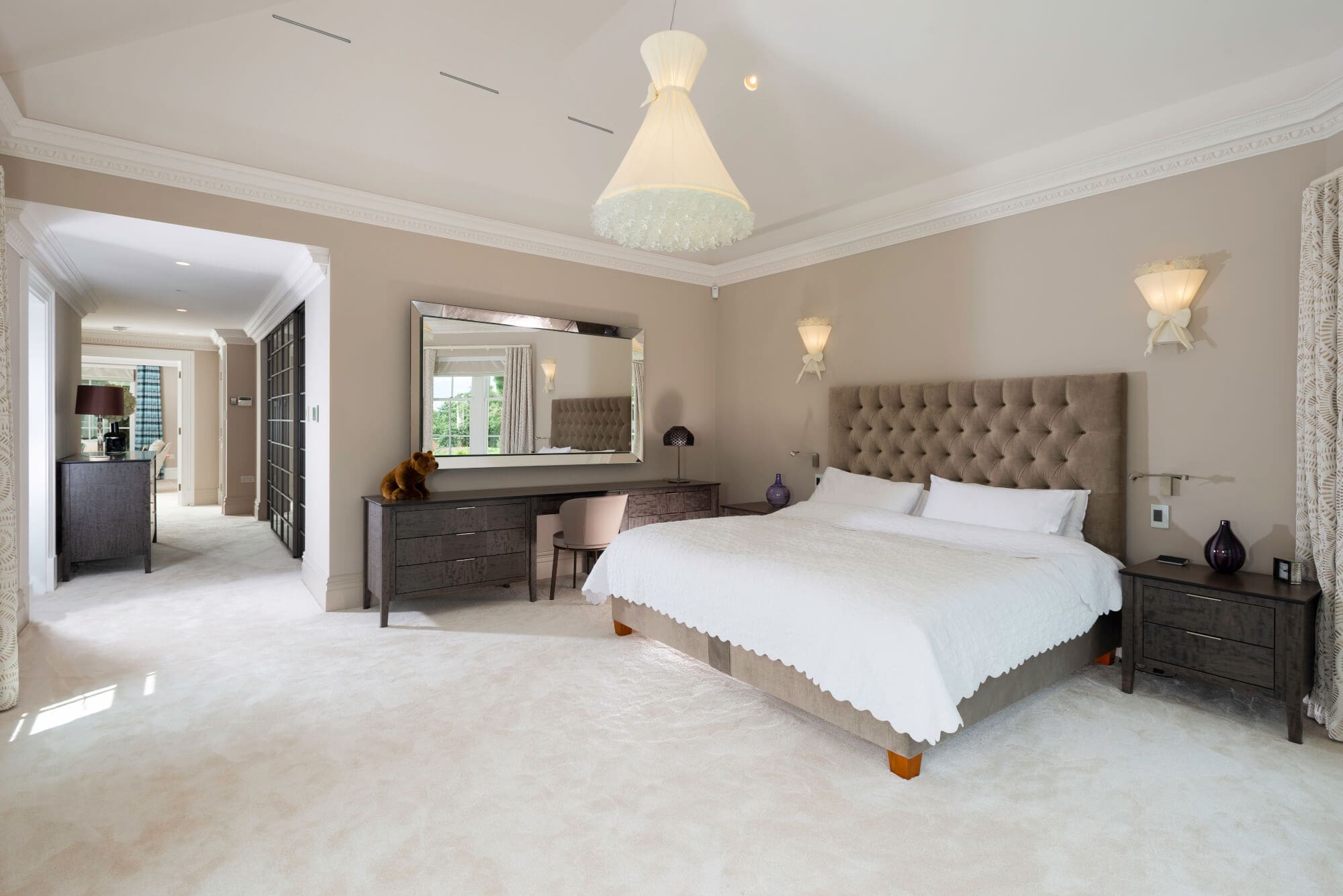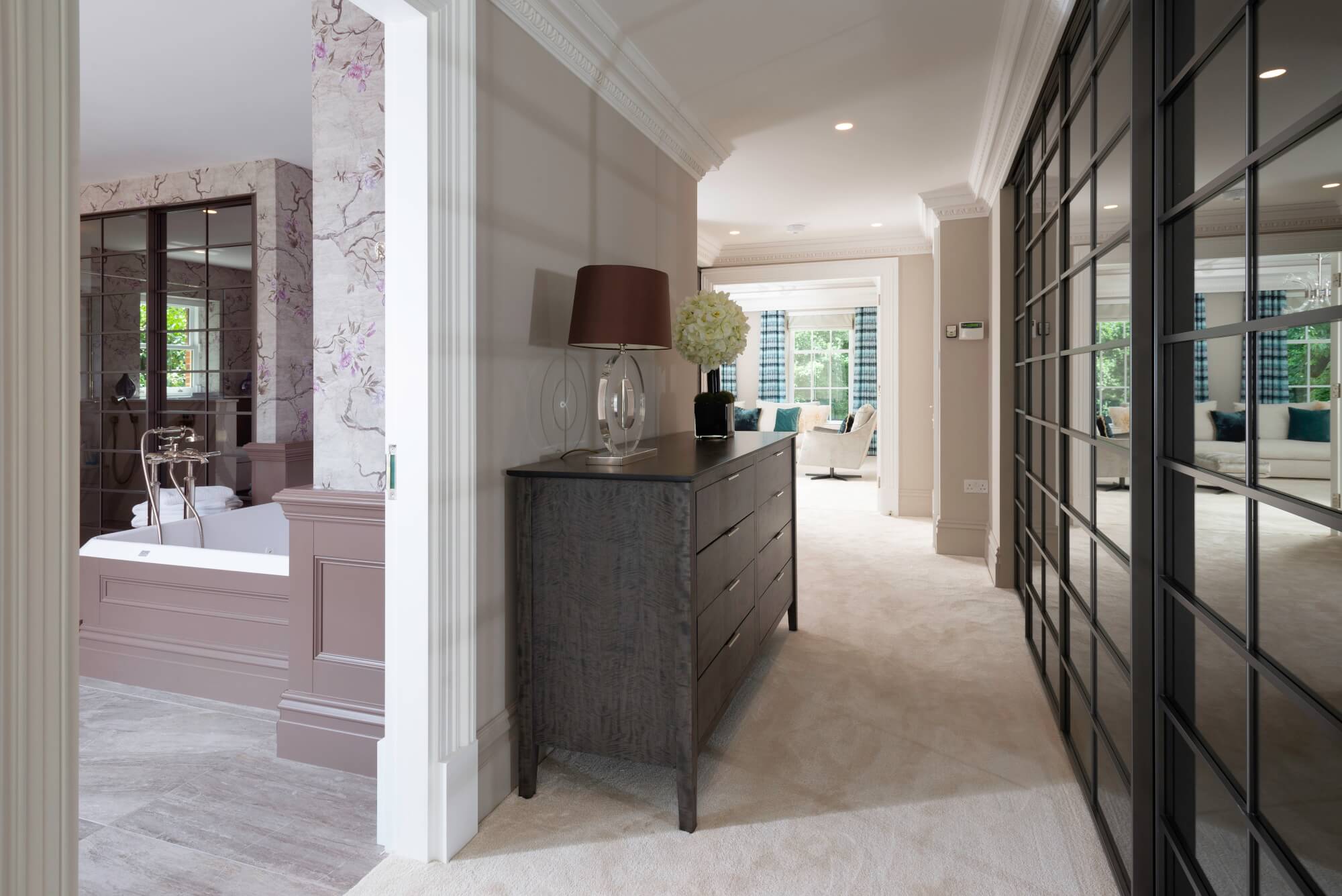 The principal suite is composed as a calm retreat, with flexible separation between spaces. A Rimadesio sliding partition allows the his-and-hers ensuites to open or close as required, supporting privacy while maintaining a cohesive suite arrangement.