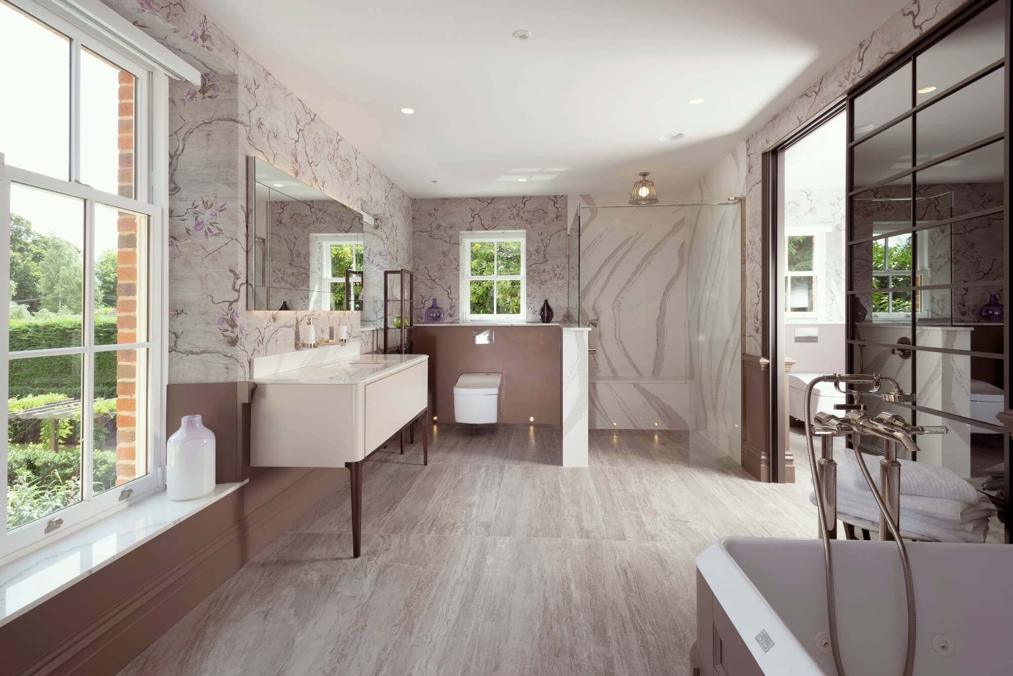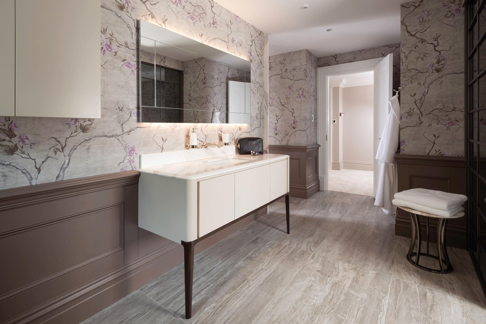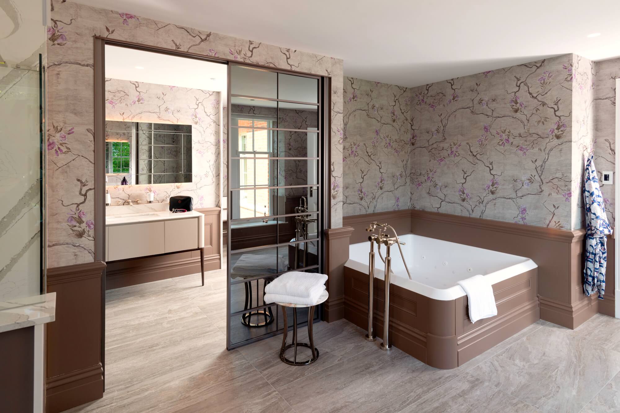 One ensuite is organised around a Hafro Bolla whirlpool bath with an integrated step for comfort and accessibility, paired with refined vanity units and polished nickel brassware to balance classic and contemporary cues. The second ensuite adopts a more architectural, restrained tone, featuring an AXOR Starck Shower Heaven and stone finishes across walls and surfaces. Bespoke panelling, integrated benches, and a neutral palette carry across both rooms, keeping the suite quietly consistent and tailored to modern living.