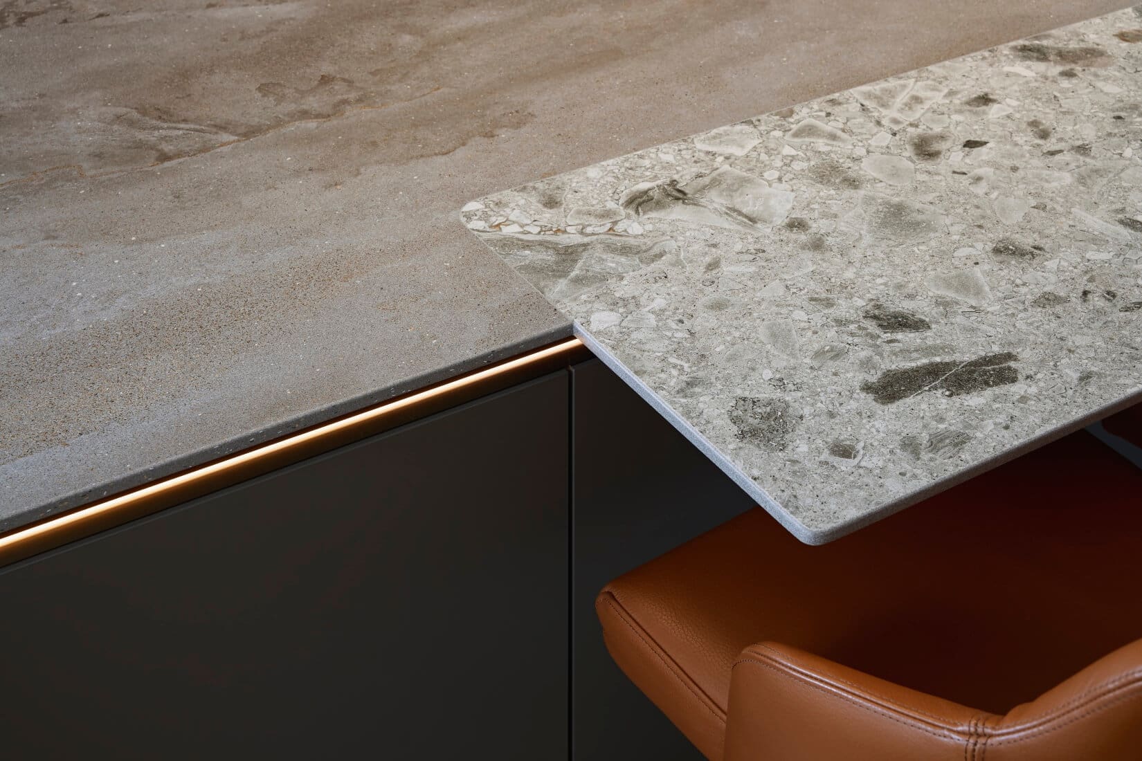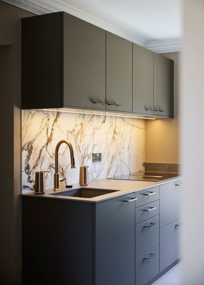 The work surfaces, crafted from Inalco MDI Vint, are complemented by a cantilevered flush-mounted breakfast bar in MDI Iseo Gris, providing a functional and stylish gathering spot. Wall panels in Neolith book-matched Calacatta Luxe Ultra Soft marble create a striking focal point, tying the design together with seamless elegance.