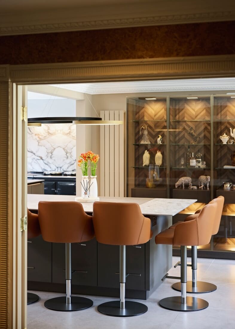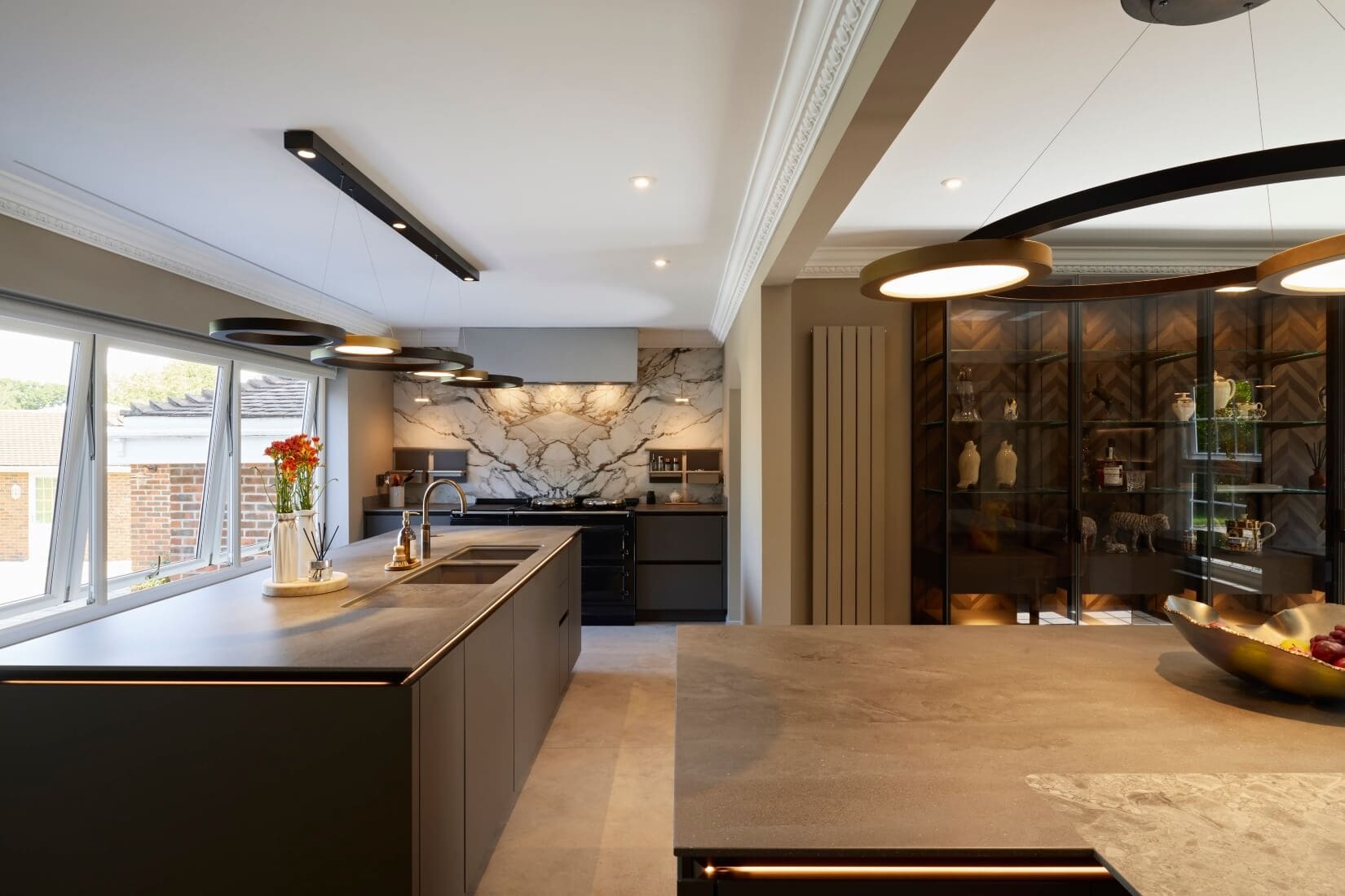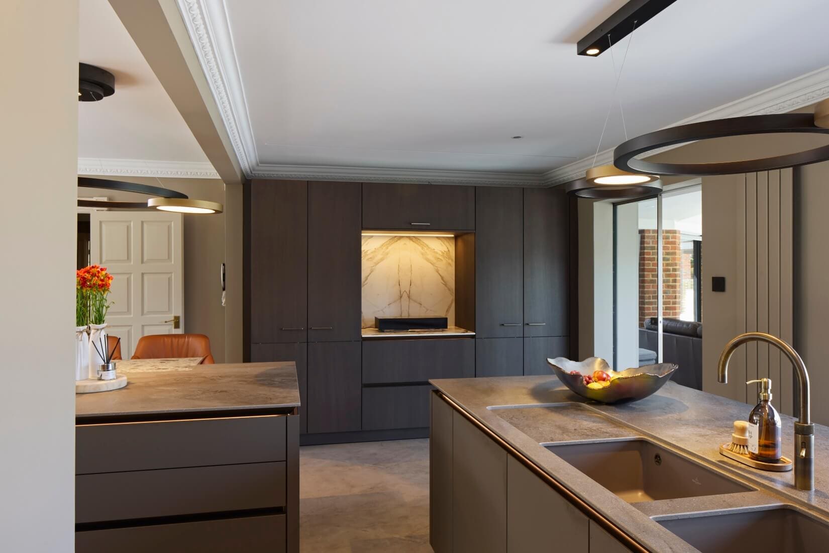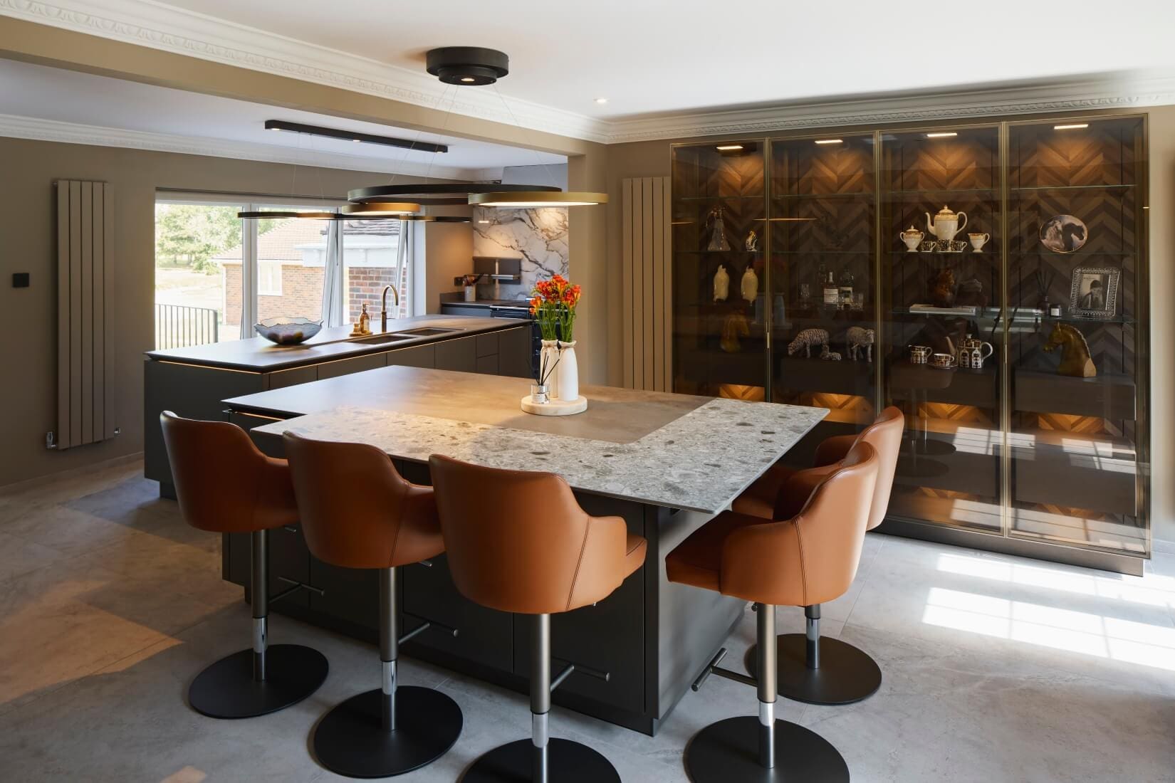 This kitchen blends luxurious finishes with functional design to create a truly captivating space. SieMatic SLX cabinetry features an elegant combination of Umbra laminate with Gold Bronze handle recesses and Hazel Brown Oak Veneer with matching handles. Tall glass cabinets with Parsol glass and Gold Bronze-framed doors reveal Hazel Brown Oak interiors and Tarsie veneer back panels, adding depth and sophistication.