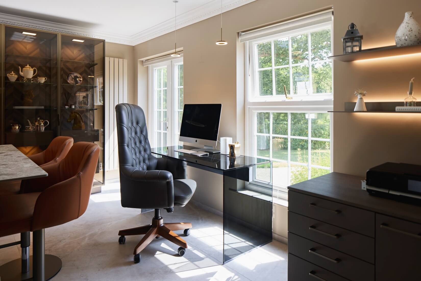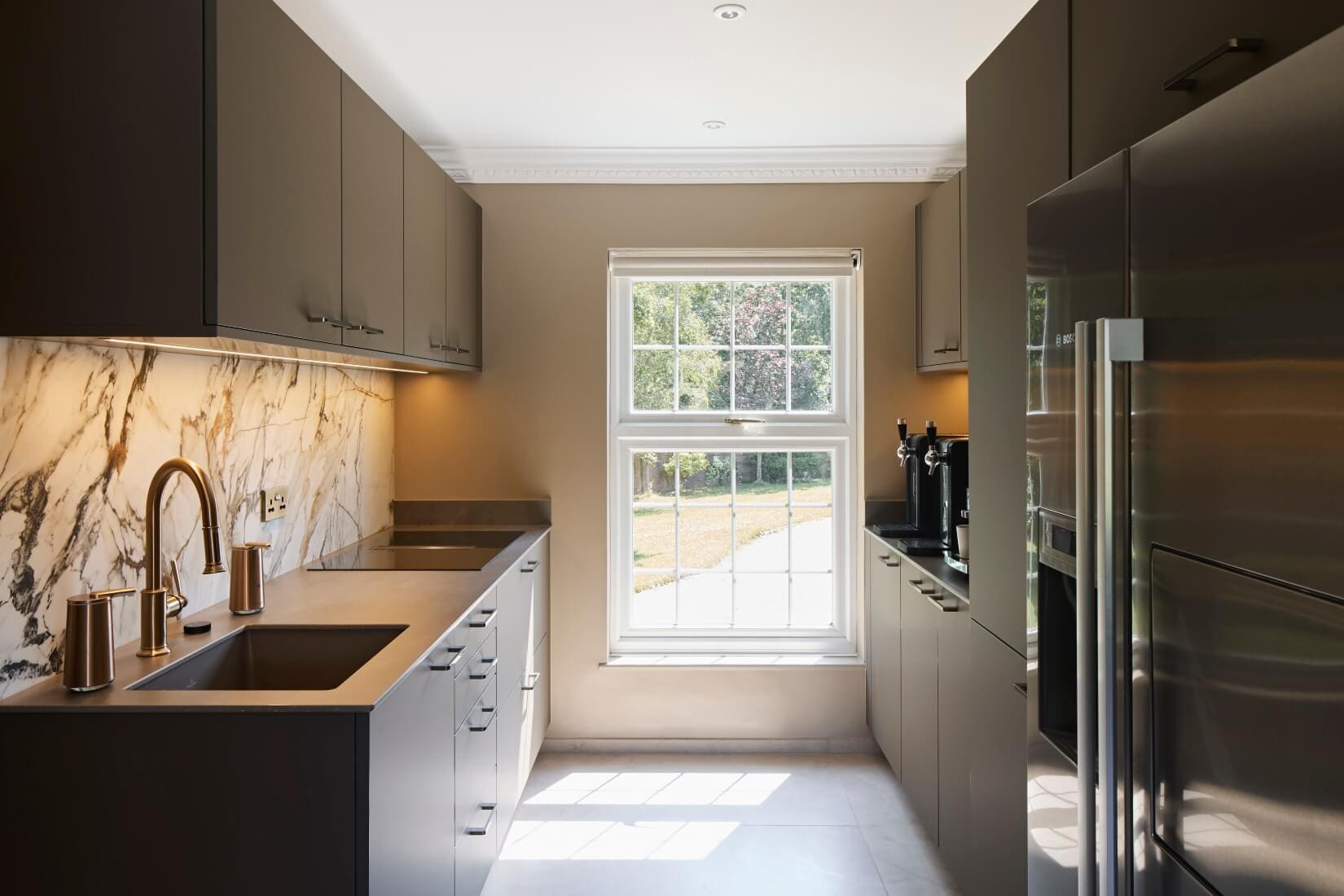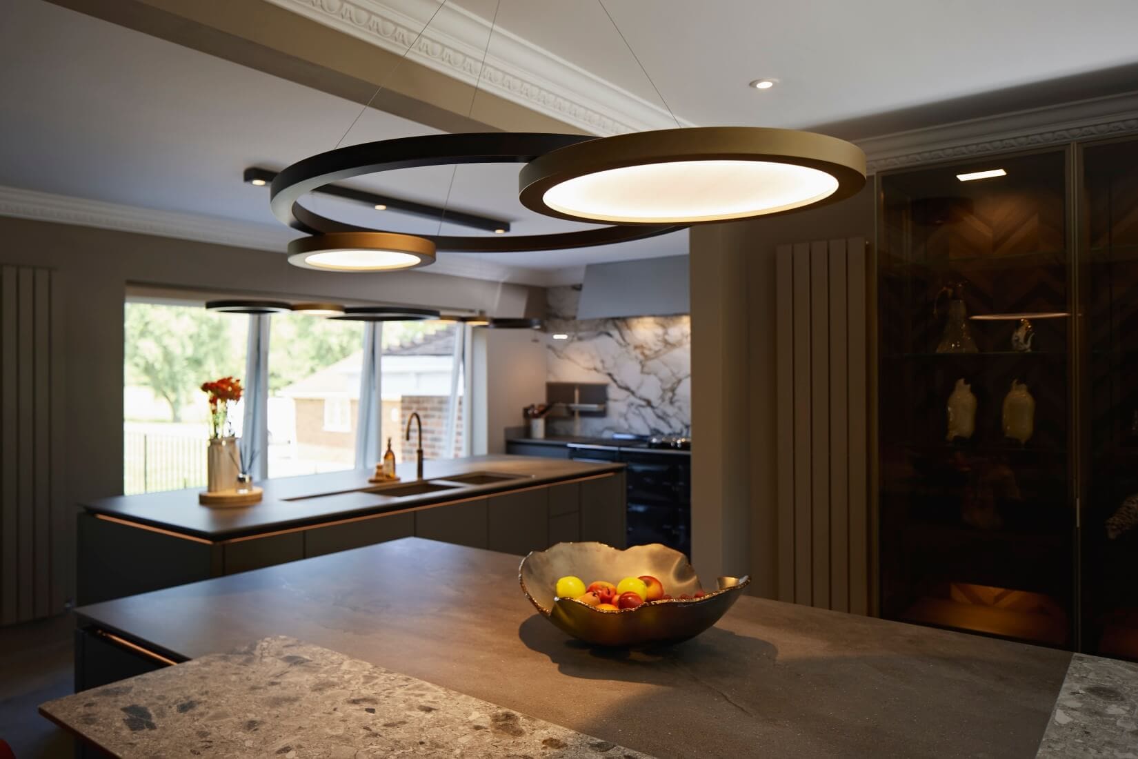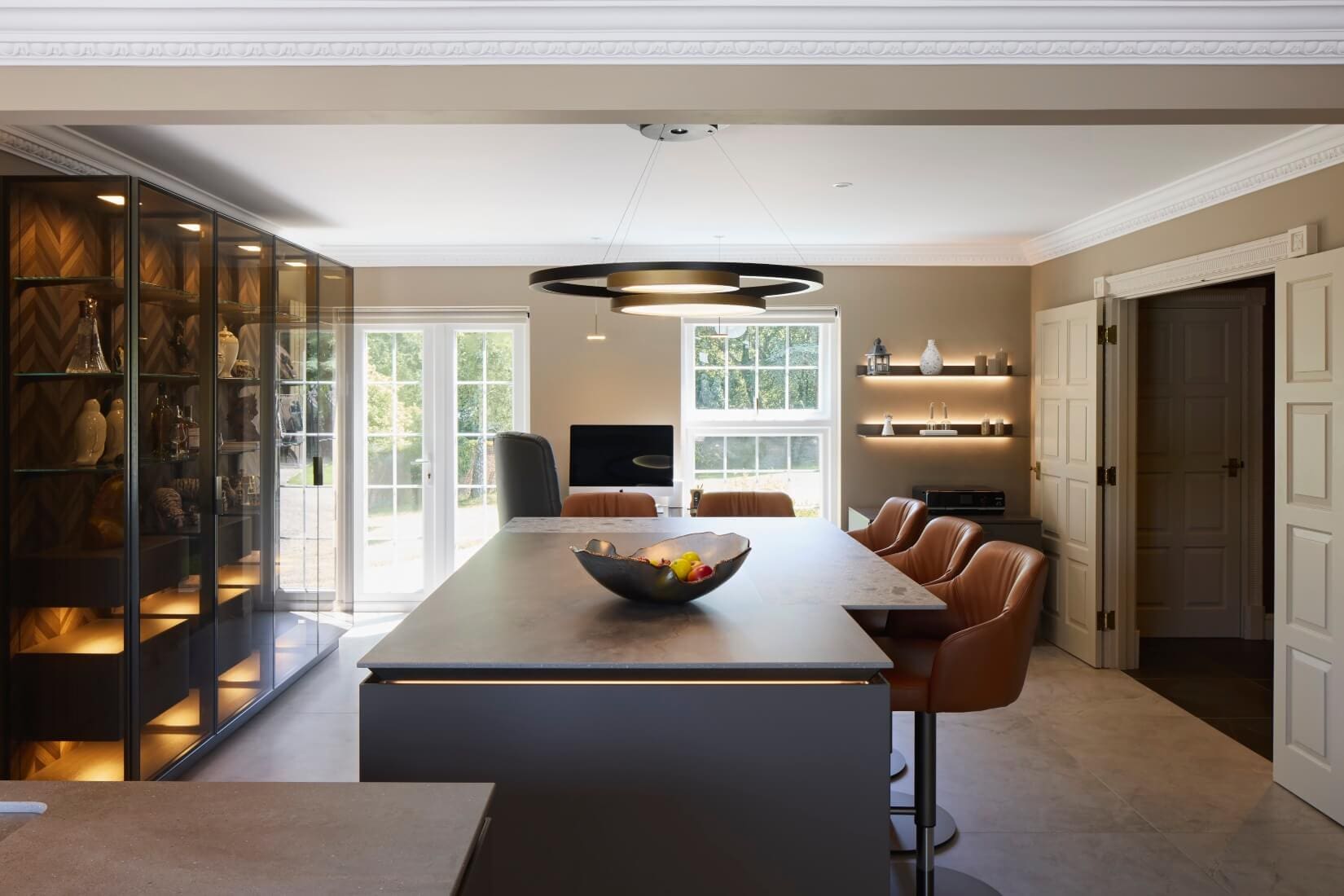 This kitchen blends luxurious finishes with functional design to create a truly captivating space. SieMatic SLX cabinetry features an elegant combination of Umbra laminate with Gold Bronze handle recesses and Hazel Brown Oak Veneer with matching handles. Tall glass cabinets with Parsol glass and Gold Bronze-framed doors reveal Hazel Brown Oak interiors and Tarsie veneer back panels, adding depth and sophistication.