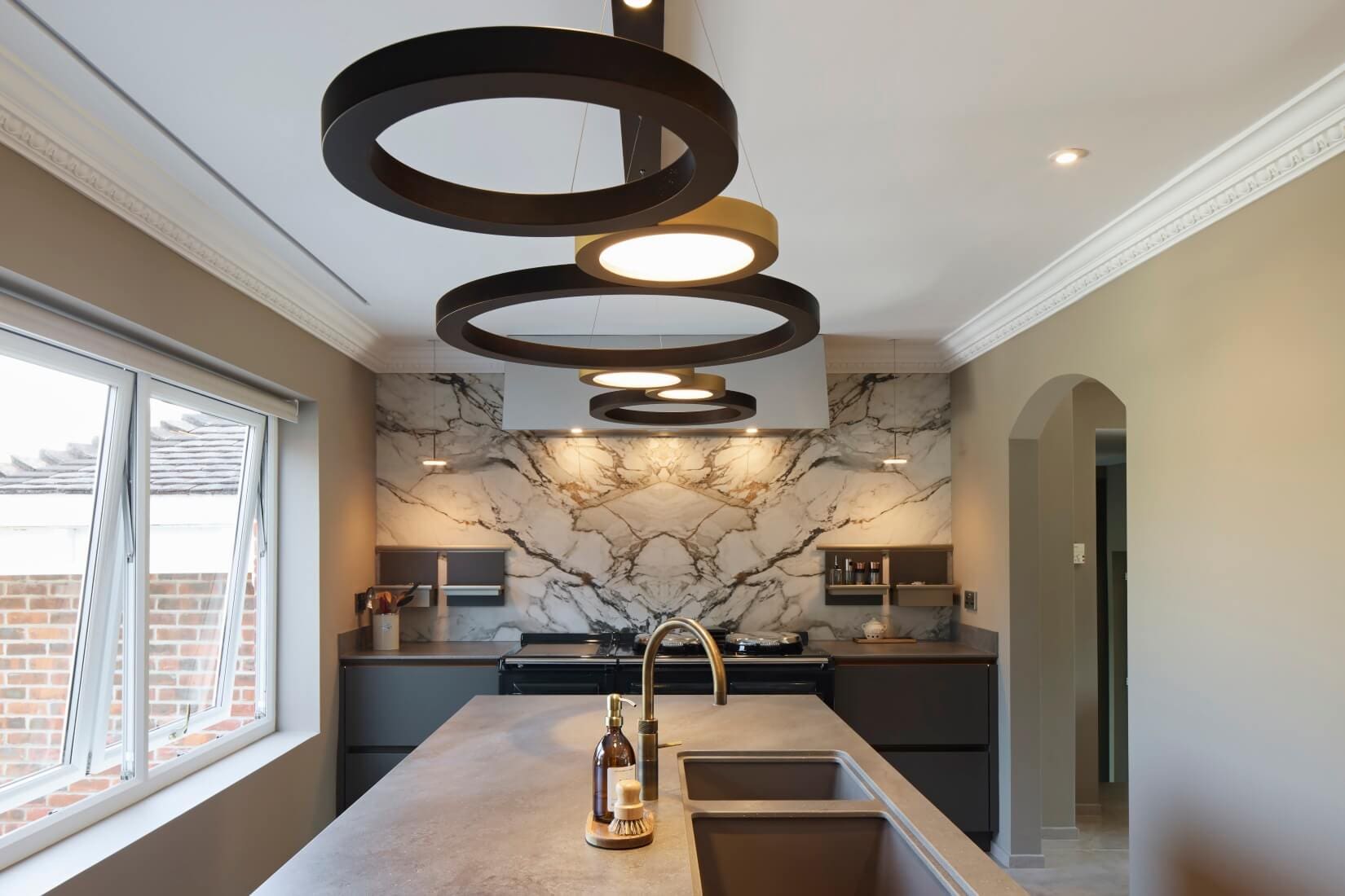Dream Design’s suggestion to position the sink within the island enabled the removal of cabinetry along the exterior wall. This allowed the installation of a panoramic window set below the worktop height, framing uninterrupted views of the terrace and lake.