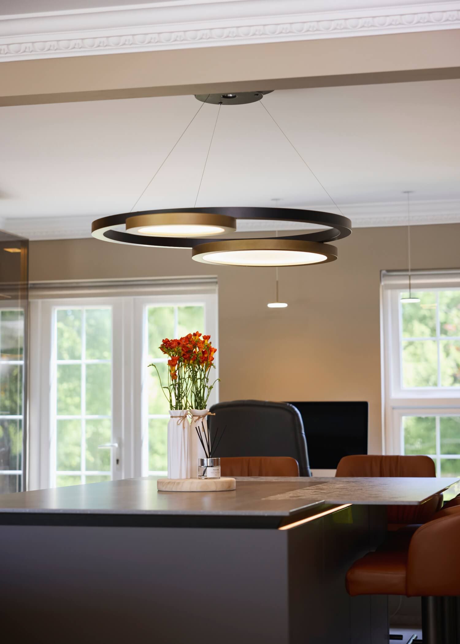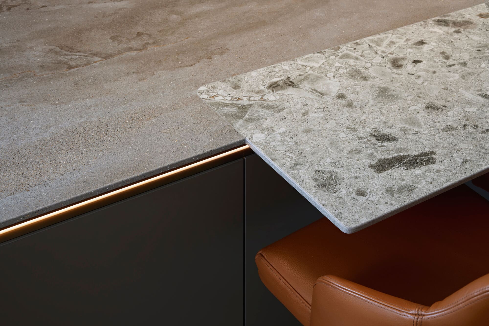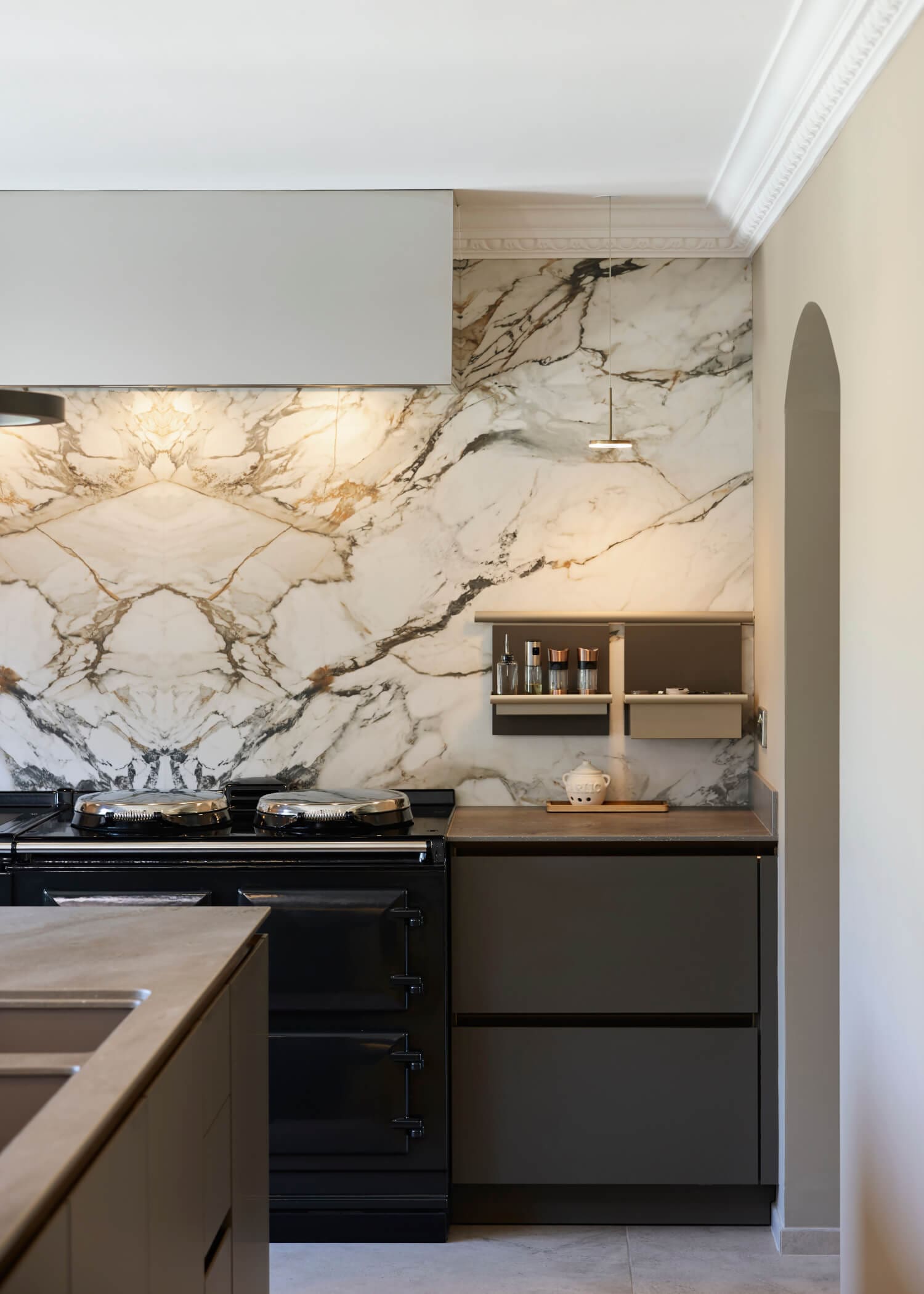 Work surfaces are specified in Inalco MDI Vint, with a cantilevered, flush-mounted breakfast bar in MDI Iseo Gris to create a natural gathering point without interrupting circulation. Wall panels in book-matched Neolith Calacatta Luxe Ultra Soft form a focal elevation, set out for alignment and continuity so the veining reads as one surface rather than applied pieces. Furniture and lighting were selected from specialist partners including Contardi and Poltrona Frau to complete the room with measured warmth and presence.