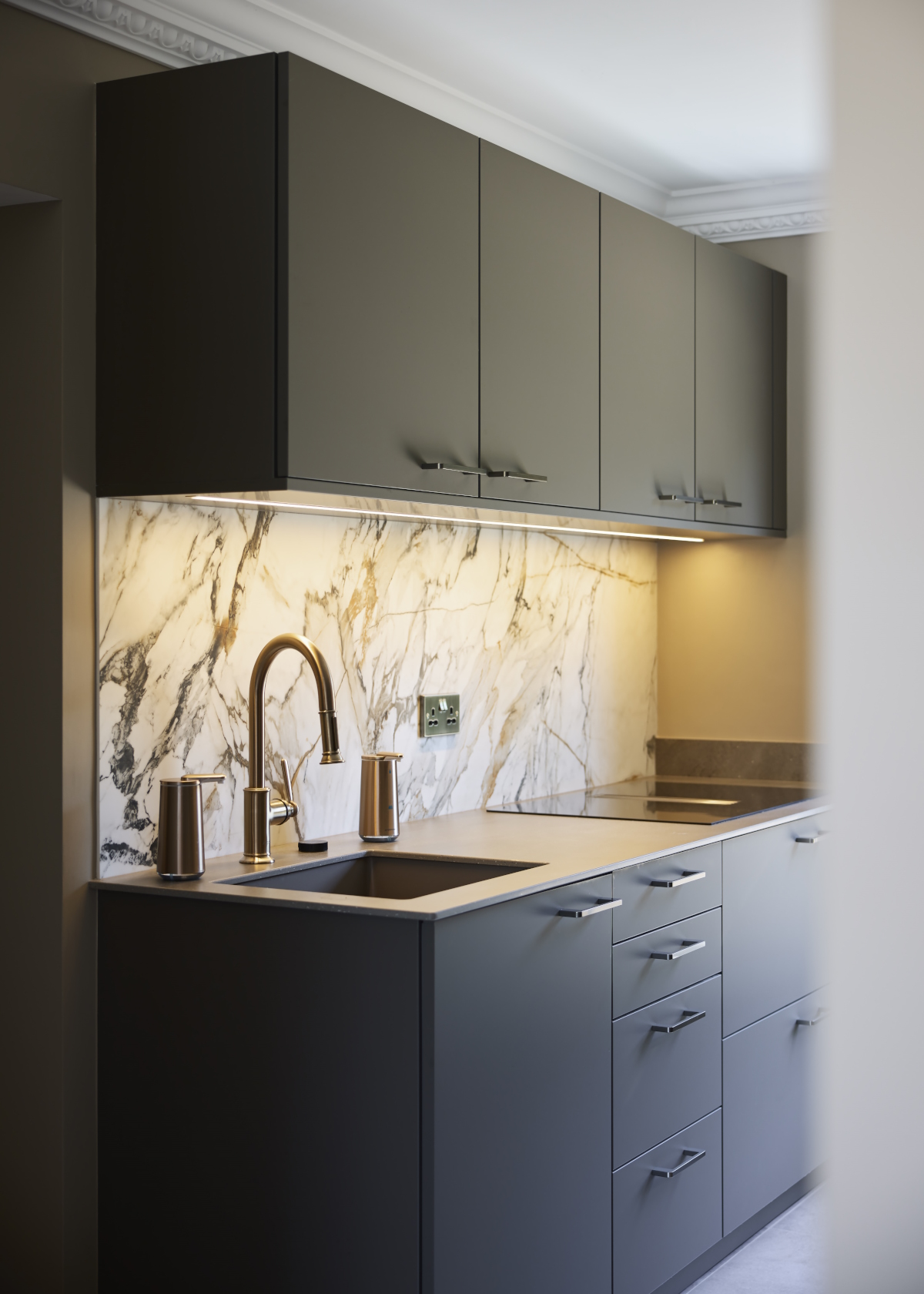 Appliance integration is resolved through coordination. Ventilation allowances, power positions and access panels align to the cabinet grid so elevations stay continuous and maintenance access remains workable.